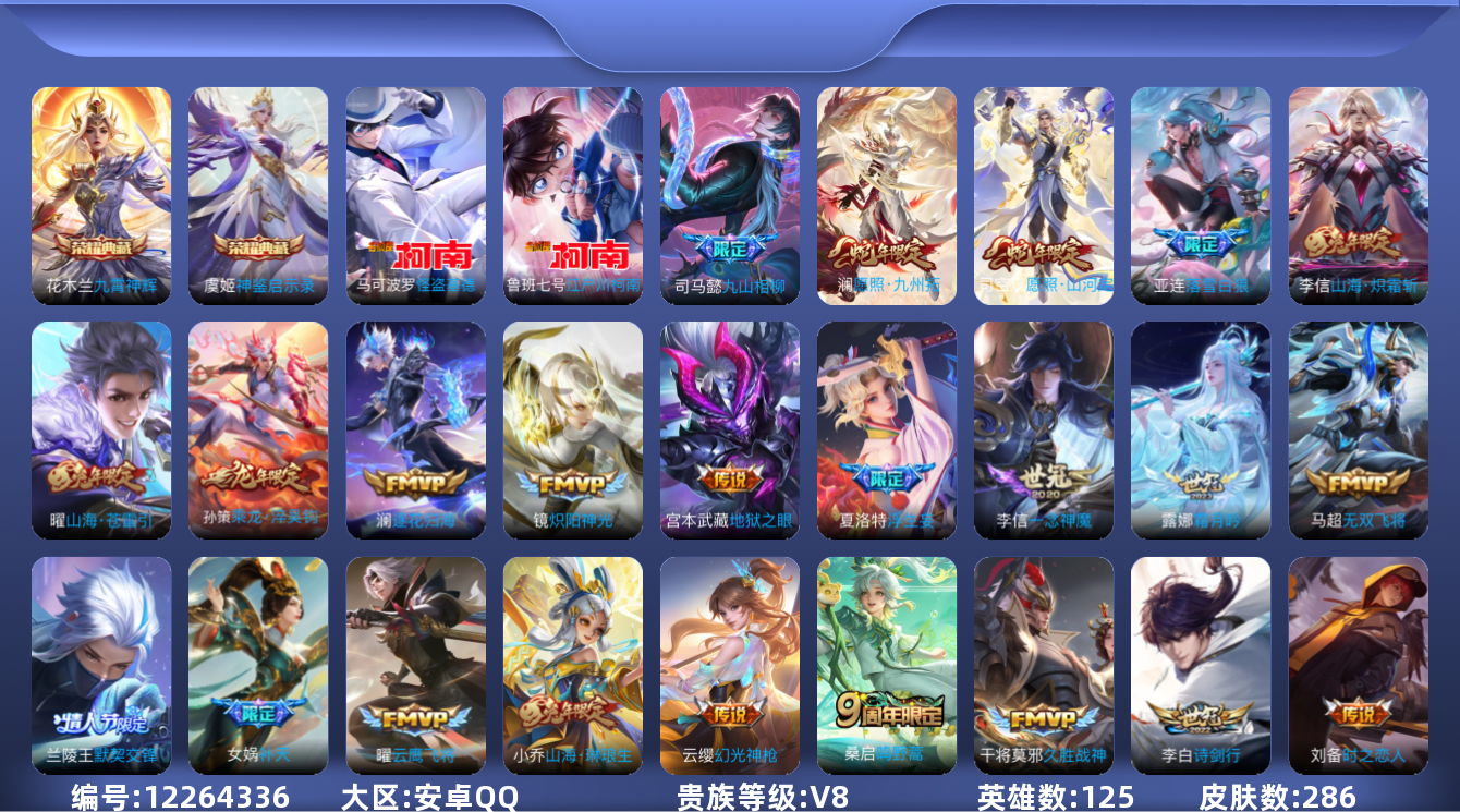 [12264336]V8 2典藏 2珍品传说 31传说 125英雄 286皮肤 可修改实名 优质装备:九霄神辉(木兰典藏),神鉴启示录,江户川柯南,怪盗基德,冠军飞将,云鹰飞将(小将军),绛天战甲(鸡嘴战神),久胜战神,炽阳神光,一念神魔,零号·赤焰,地狱之眼,时之恋人-刘备(电焊工),超时空战士-狄仁杰,无双飞将,山海·炽霜斩(李信年限),山海·琳琅生(小乔年限),山海·苍雷引(电光曜子),浮生妄,妄想实况,霜月吟,澜逐花归海 传说皮:乘龙·淬吴钩(孙策年限),落雪白狼,九山相柳,幻光神枪 珍宝阁皮:万物之道,蔷薇恋人 限定皮:愿照·九州拓(澜年限),愿照·山河定(司空震年限),陌上桑,鸣野蒿,傲雪梅枪,补天,飞衡(韩信年限),山海·碧波行(瑶年限),无限倾心-项羽,影龙天霄,诗剑行,五谷丰年,梁祝,御风骁将(吕布年限),龙胆,岱宗(典韦年限),逐梦之音,默契交锋-兰陵王,孙行者,玉兔公主,神器·万象笔,山海·玄木吟(马可年限),冰霜神祇 史诗皮:化蝶舞,星界战将,龙之律动,雪豹·霜爪,茶境仙,怒海争锋,炽弈燎原,东方月初,蒙犽顽岩魄,芈月浮光幕影,琥珀纪元伽罗,蔬乡物语(鲁班七号),紫霞仙子,千年之狐,永昼,江河有灵,匿光侦查者,鹤归松栖(赵怀真),雪夜绮愿(周瑜),真我赫兹(百里守约),魅语,百解令(蒙犽),高渐离燃音魔法,蒙恬荣光圣徽,匿光破解者,冰冠公主,偶像歌手,百相守梦(刘备),暗夜猫娘,猫狗日记-大乔,节奏热浪,修罗,女仆咖啡,水果甜心,星夜王子,心灵骇客,功夫厨神,暗隐猎兽者,幽灵船长,鬼剑武藏,暗渊魔法,天秀·启明,舞动绿茵,诗语江南,纤云弄巧,拒霜思,乘风破浪,逐浪之夏,水晶猎龙者,金属风暴,圣诞狂欢,圣诞恋歌,鹰眼统帅,暗夜贵公子,无心,未来纪元-赵云