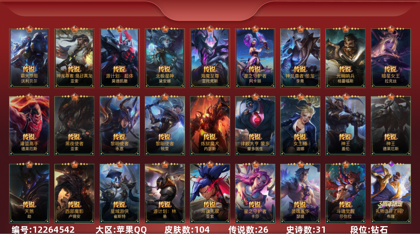 [12264542]1限定 26传说 31史诗 104皮肤 可二次 可修改实名 优质装备:灌篮高手,黑夜使者亚索,黎明使者锐雯,炼狱魔犬,律政大亨,女主播风女,神王盖伦,神王诺手,天煞劫,西部魔影卢锡安,星域游侠卡牌,源计划:林,暗星女王拉克丝,光明哨兵格雷福斯,星之守护者卡莎,灵魂莲华腕豪,斗魂觉醒 莎弥拉 段位:钻石 限定皮肤:关羽云长 传说皮:神龙尊者 圣龙 李青,神龙尊者 昼日真龙 亚索,霸天原祖 沃利贝尔,源计划:超体,斗魂无双亚索,北极星神 黛安娜,海魔至尊 亚托克斯,星之守护者 阿卡丽,黎明使者永恩 亮点:灌篮高手,黑夜使者亚索,黎明使者锐雯,炼狱魔犬,律政大亨,女主播风女,神王盖伦,神王诺手,天煞劫,西部魔影卢锡安,星域游侠卡牌,源计划:林,暗星女王拉克丝,光明哨兵格雷福斯,星之守护者卡莎,灵魂莲华腕豪,斗魂觉醒 莎弥拉