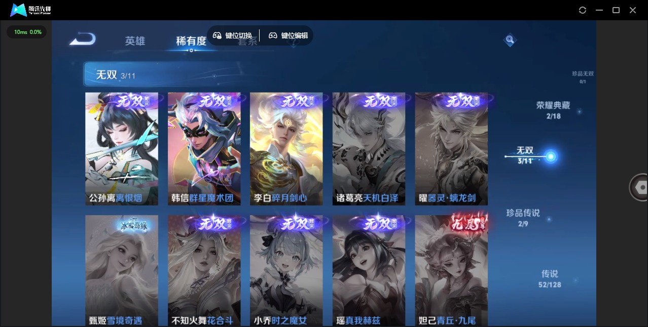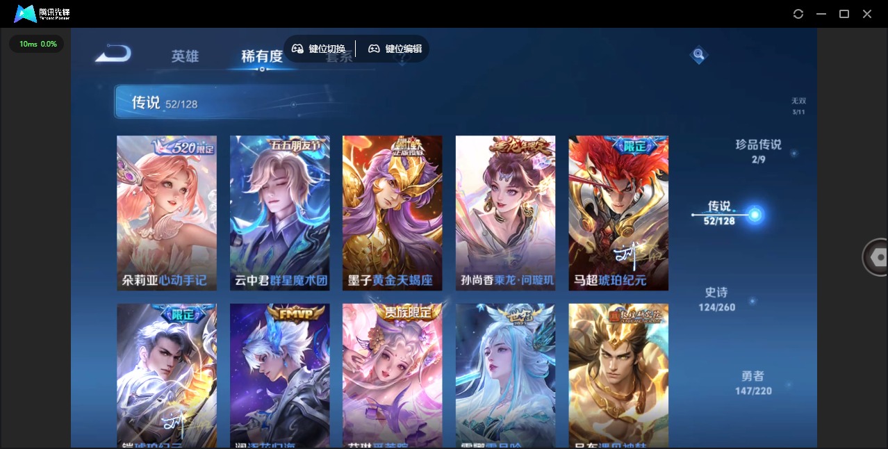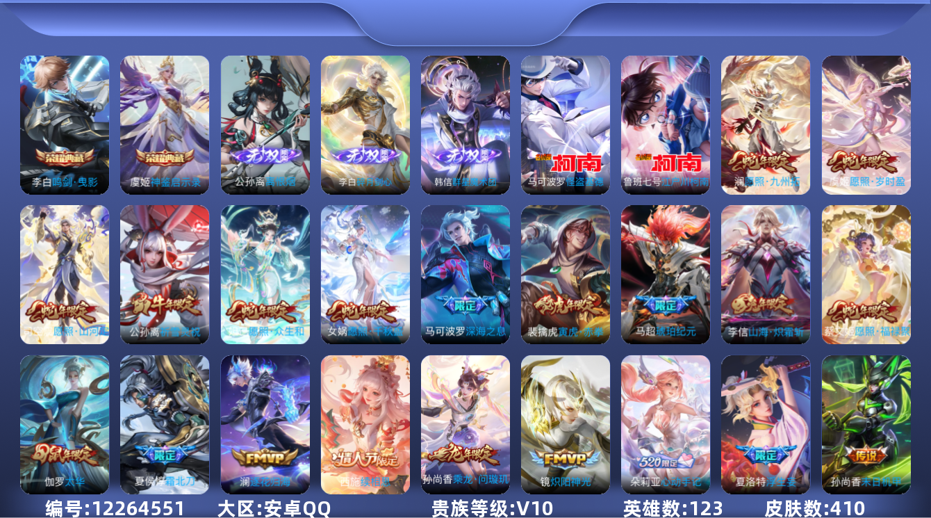 [12264551]V10 2典藏 3无双 2珍品传说 52传说 123英雄 410皮肤 可修改实名 优质装备:鸣剑·曳影,碎月剑心(李白无双),神鉴启示录,韩信群星魔术团(韩信无双),离恨烟(公孙离无双),江户川柯南,怪盗基德,黄金狮子座,云鹰飞将(小将军),绛天战甲(鸡嘴战神),黄金白羊座,猫影幻舞,炽阳神光,一念神魔,末日机甲-孙尚香(绿蚂蚱),仲夏夜之梦(大飞蛾),零号·赤焰,时之恋人-刘备(电焊工),超时空战士-狄仁杰,末日机甲-孙策,无双飞将,碎云,山海·炽霜斩(李信年限),山海·琳琅生(小乔年限),炽翼辉光(娃娃菜牛角包),画中仙,浮生妄,记忆之芯(机甲兔),电玩·雷克斯,妄想实况,遇见神鼓,霜月吟,澜逐花归海,艾琳觅芳踪,琥珀纪元铠,琥珀纪元马超,黄金天蝎座,云中君群星魔术团,朵莉亚心动手记 传说皮:乘龙·问璇玑(孙尚香年限),续相思 珍宝阁皮:妄想食味,胡桃夹子 限定皮:愿照·九州拓(澜年限),愿照·福禄聚(蔡文姬年限),愿照·岁时盈(虞姬年限),愿照·山河定(司空震年限),愿照·众生和(妲己年限),愿照·千秋盛(女娲年限),逐霄战戟,映山客,陌上桑,鸣野蒿,夏侯惇霜北刀,至尊宝,太华(伽罗年限),武陵仙君(小桃花),傲雪梅枪,时之彼端,白鹤梁神女,魔法小厨娘,时雨天司(水龙头),神威(电光马子),飞衡(韩信年限),至美·乘鲤谣,遇见飞天,齐天大圣,匿光决锋者,五谷丰年,游园惊梦,梁祝,岱宗(典韦年限),祈雪灵祝(雪兔子),李小龙,朱雀志(守约年限),辉光之辰,霸王别姬-项羽,霸王别姬-虞姬,圣诞老人,孙行者,蜜橘之夏,寅虎·赤拳(老虎年限),百木心枪,玉兔公主,启示之音,深海之息(深海大菠萝) 史诗皮:绮世丹青,星界战将,谪仙醉月,茶境仙,怒海争锋,炽弈燎原,撼地雄心,破空之剑,战舞者,涂山红红,东方月初,蒙犽顽岩魄,埋骨钱,芈月浮光幕影,海诺心动手记,琥珀纪元伽罗,夜落电台,上官婉儿群星魔术团,奇遇星旅,蔬乡物语(鲁班七号),百相守梦-百里守约,星界特工,遇见神鹿,紫霞仙子,白龙吟,黄金分割率,特工魅影,千年之狐,江河有灵,匿光侦查者,真我赫兹(百里守约),浮梦罗烟,魅语,百解令(蒙犽),高渐离燃音魔法,蒙恬荣光圣徽,无限星赏官,冰冠公主,白蛇,晚萤,银翎春语,末日机甲-吕布,猫狗日记-孙策,猫狗日记-大乔,乱世虎臣,节奏热浪,女仆咖啡,摇滚巨星,水果甜心,