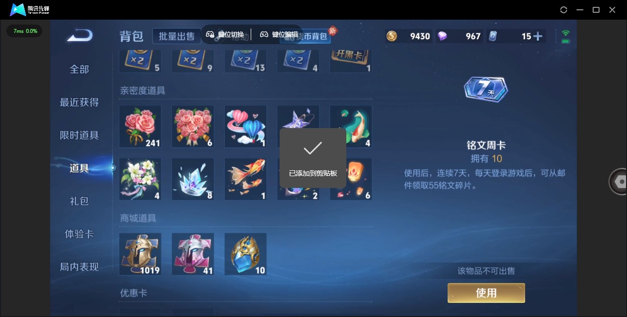 - PX_2096866-实名: 可修改 贵族等级: V7 英雄数: 122 皮肤数: 242 传说皮: 黄金射手座,挚爱之约,神器·狴犴令,山海·炽霜斩,燃星之曲,浮生妄,幻光神枪 限定皮: 李小龙,奔雷神使,梁祝,龙胆,寅虎·御盾,武陵仙君,高山流水,猪悟能,时之祈愿-云中君,时之祈愿-瑶,百木心枪,玉兔公主,匿光决锋者,深海之息,五谷丰年,鸣野蒿,逐霄战戟,愿照·山河定