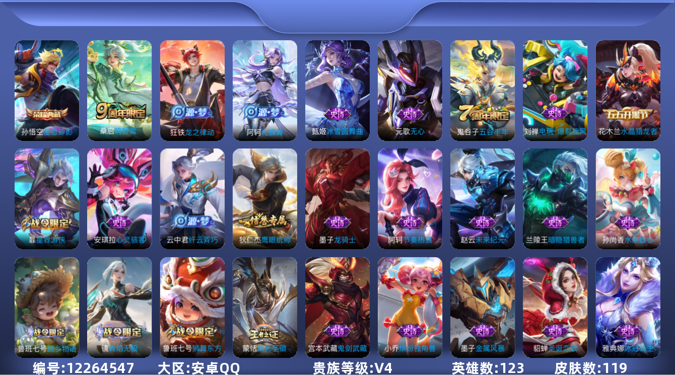 [12264547]V4 1典藏 1传说 123英雄 119皮肤 可修改实名 优质装备:全息碎影(猴子典藏) 珍宝阁皮:玩趣恶龙 限定皮:逐霄战戟,鸣野蒿,五谷丰年 史诗皮:化蝶舞,龙之律动,蔬乡物语(鲁班七号),蒙恬荣光圣徽,冰冠公主,电玩·爆裂旋风,龙骑士(小龙虾),节奏热浪,水果甜心,绅士熊喵,心灵骇客,暗隐猎兽者,鬼剑武藏,纤云弄巧,缤纷独角兽,水晶猎龙者,金属风暴,圣诞恋歌,鹰眼统帅,无心,未来纪元-赵云