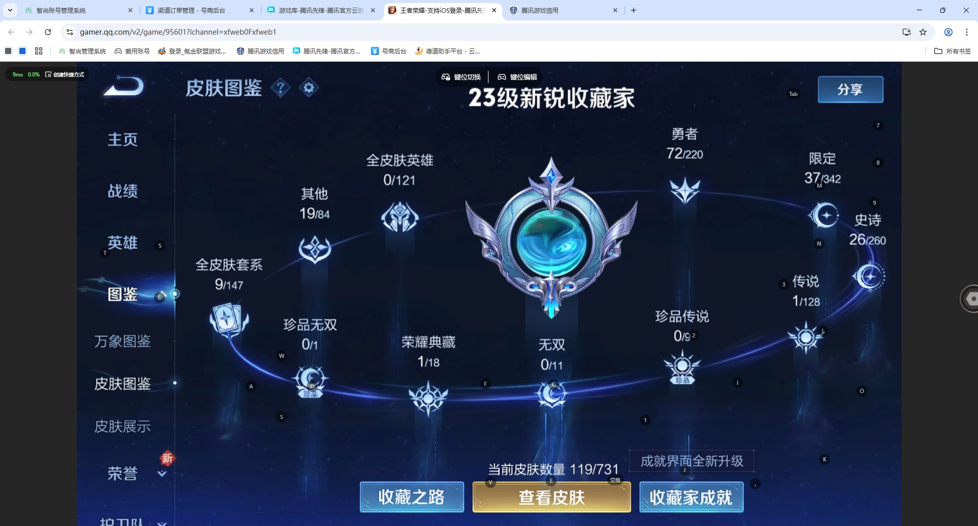 - PX_2100581-实名: 可修改 贵族等级: V7 英雄数: 124 皮肤数: 243 荣耀水晶: 九霄神辉 传说皮: 黄金狮子座,云鹰飞将,一念神魔,零号·赤焰,山海·炽霜斩 限定皮: 遇见飞天,李小龙,奔雷神使,游园惊梦,梁祝,时雨天司,逐梦之音,至尊宝,霸王别姬-虞姬,五谷丰年,山海·玄木吟,逐霄战戟