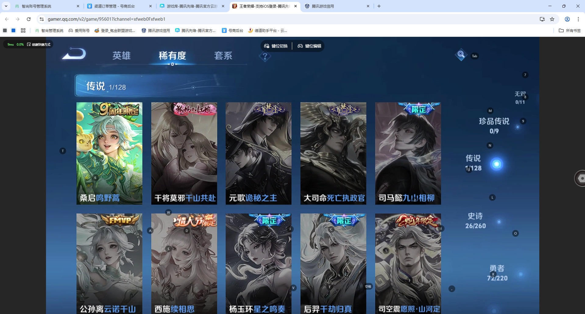 - [12315488]V6 3传说 124英雄 123皮肤 可修改实名 优质装备:一念神魔,炽翼辉光(娃娃菜牛角包) 珍宝阁皮:蔷薇恋人 限定皮:至尊宝,高山流水,无限倾心-虞姬,五谷丰年,梁祝,李小龙,默契交锋-花木兰,孙行者,匿光追影者 史诗皮:龙之律动,百相守梦-黄忠,织梦人,特工魅影,江河有灵,蒙恬荣光圣徽,偶像歌手,乱世虎臣,女仆咖啡,水果甜心,幽灵船长,鬼剑武藏,地狱岩魂,拒霜思,水晶猎龙者,金属风暴,圣诞狂欢,圣诞恋歌,鹰眼统帅,魅力维加斯