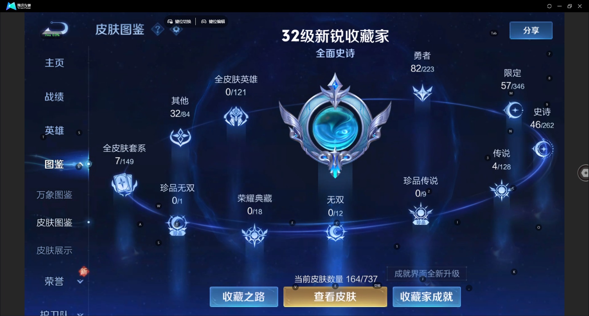 - PX_2085836-25 安卓微信/尊贵铂金/316皮肤/124英雄/3典藏/0珍品无双/0无双/0珍品传说/23传说/81史诗/8稀有英雄 【3 典藏皮肤】银白咏叹调 铠,九霄神辉 花木兰,星域神启 诸葛亮, 【23 传说皮肤】启明星使 虞姬,云霓雀翎 虞姬,零号·赤焰 孙悟空,云鹰飞将 曜,神器·狴犴令 狄仁杰,猫影幻舞 貂蝉,音你心动 周瑜,黄金射手座 后羿,怒海麟威 吕布,乞巧织情 王昭