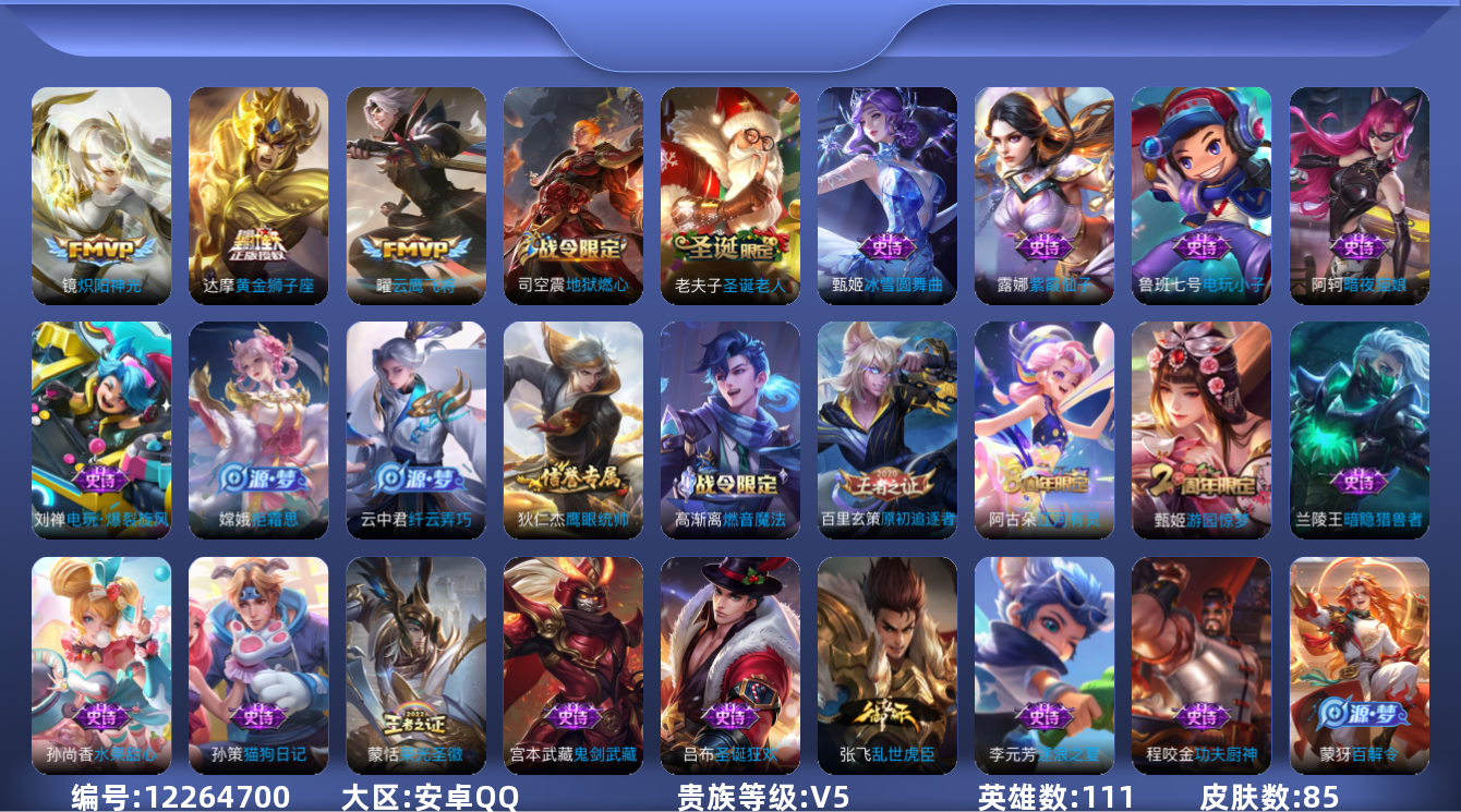 - [11455512]【商品标题】:安卓Q-V4-至尊星耀I段位-120英雄-132皮肤-0典藏-0珍品无双-0无双-0珍品传说-5传说-28史诗 【传说皮肤】:云缨幻光神枪,桑启鸣野蒿,鲁班七号时之奇旅,孙悟空零号赤焰,花木兰冠军飞将 【限定皮肤】:姜子牙天穹之誓,狄仁杰阴阳师,赵云皇家上将,鲁班七号时之奇旅,庄周高山流水,达摩沙漠行僧,项羽海滩派对,兰陵王金庭之子,孙悟空零号赤焰,李元芳云中旅人,鬼谷子五谷丰年,沈梦溪大漠名商,裴擒虎擒涛扼浪,西施玲珑珍味,鲁班大师探海日志,桑启海盐诗旅,戈娅驭风魔法,阿古朵江河有灵,张良古海寻踪,鬼谷子天穹祈灯,姬小满妄想食味,沈梦溪龙舞盛年,刘邦剑破天穹,程咬金群星魔术团,刘备异域游侠,周瑜熔金海岸 【赛季限定】:达摩沙漠行僧,兰陵王金庭之子,张良古海寻踪,李元芳云中旅人,沈梦溪大漠名商,裴擒虎擒涛扼浪,鲁班大师探海日志,桑启海盐诗旅,鬼谷子天穹祈灯,刘邦剑破天穹,姜子牙天穹之誓 【战令限定】:西施玲珑珍味,戈娅驭风魔法 【史诗皮肤】:赵云皇家上将,赵云未来纪元,貂蝉圣诞恋歌,甄姬冰雪圆舞曲,王昭君偶像歌手,宫本武藏鬼剑武藏,孙尚香水果甜心,妲己魅力维加斯,妲己女仆咖啡,墨子金属风暴,刘禅绅士熊喵,曹操幽灵船长,吕布末日机甲,张飞乱世虎臣,夏侯惇乘风破浪,亚瑟心灵战警,雅典娜冰冠公主,铠曙光守护者,阿轲节奏热浪,孙策猫狗日记,狄仁杰鹰眼统帅,庄周高山流水,鬼谷子五谷丰年,戈娅驭风魔法,阿古朵江河有灵,姬小满妄想食味,亚连破空之剑,狂铁龙之律动 【其他皮肤】:项羽海滩派对,韩信教廷特使,韩信街头霸王,赵云白执事,赵云忍炎影,白起白色死神,扁鹊化身博士,扁鹊救世之瞳,孙膑天使之翼,姜子牙时尚教父,妲己少女阿狸,典韦黄金武士,亚瑟死亡骑士,张飞五福同心,宫本武藏万象初新,狄仁杰阴阳师,关羽龙腾万里,钟无艳海滩丽影,狂铁命运角斗场,老夫子功夫老勺,孙尚香沉稳之力,李白敏锐之力,大乔守护之力,明世隐虹云星官,小乔丁香结,沈梦溪鲨炮海盗猫,哪吒次元突破,狂铁特工战影,刘禅秘密基地,鲁班大师乓乓大师,达摩沙漠行僧,程咬金无双福将,兰陵王金庭之子,刘禅唤灵魔甲,沈梦溪大漠名商,李元芳云中旅人,桑启海盐诗旅,猪八戒潮玩探月行,裴擒虎擒涛扼浪,太乙真人劲辣红锅,鲁班大师探海日志,西施玲珑珍味,李元芳妄想特派,张良古海寻踪,钟无艳聚星闪耀,亚连破局者,后羿完美运算,