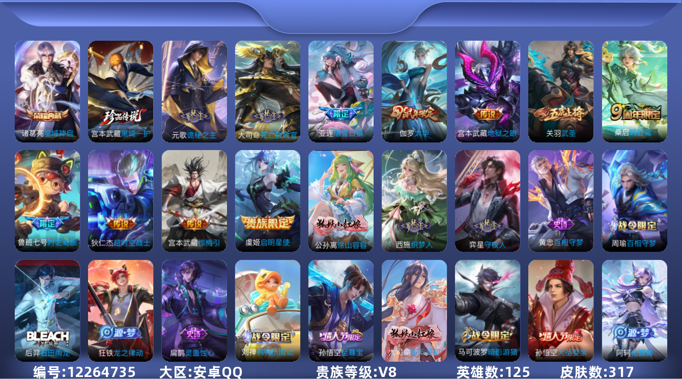 [12264735]V8 1典藏 1珍品传说 11传说 125英雄 317皮肤 可修改实名 优质装备:星域神启(倪克斯贼亮),黑崎一护,地狱之眼,超时空战士-狄仁杰,惊梅引,鲁班七号-时之奇旅,诡秘之主,涂山容容 传说皮:落雪白狼,死亡执政官 珍宝阁皮:妄想食味,蔷薇恋人 限定皮:逐霄战戟,鸣野蒿,至尊宝,太华(伽罗年限),飞衡(韩信年限),高山流水,武圣,游园惊梦,梁祝,龙胆,天狼征服者,李小龙,逐梦之影,如梦令-后羿,默契交锋-花木兰,一生所爱,大圣娶亲,引擎之心,美猴王 史诗皮:鸭鸭历险记-刘禅,化蝶舞,灵蛊蚀心,星界战将,龙之律动,石田雨龙,百相守梦-周瑜,破空之剑,东方月初,蒙犽顽岩魄,百相守梦-百里守约,百相守梦-黄忠,织梦人,守夜人,紫霞仙子,白龙吟,特工魅影,千年之狐,永昼,江河有灵,高渐离燃音魔法,蒙恬荣光圣徽,无限星赏官,冰冠公主,偶像歌手,白蛇,晚萤,末日机甲-吕布,猫狗日记-孙策,猫狗日记-大乔,时之恋人-孙尚香,乱世虎臣,节奏热浪,摇滚巨星,水果甜心,绅士熊喵,天才门将,星夜王子,心灵骇客,功夫厨神,德古拉伯爵,暗隐猎兽者,幽灵船长,鬼剑武藏,心灵战警,舞动绿茵,地狱岩魂,纤云弄巧,繁星吟游(呼啦呼啦),拒霜思,缤纷独角兽,乘风破浪,逐浪之夏,水晶猎龙者,曙光守护者,箭羽风息,金属风暴,原初追逐者,圣诞恋歌,鹰眼统帅,未来纪元-赵云