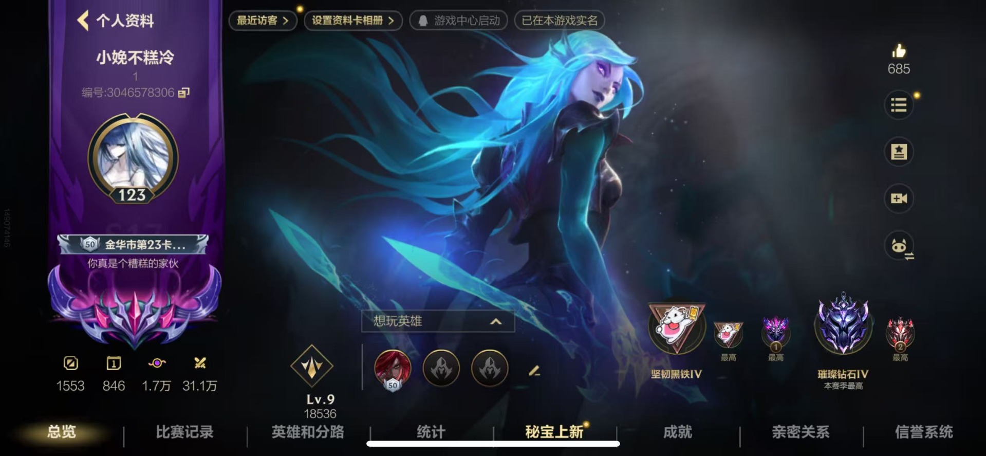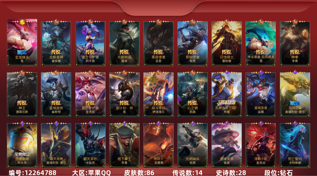 [12264788]1神话 14传说 28史诗 86皮肤 可二次 可修改实名 优质装备:光明哨兵薇恩,黑夜使者亚索,黎明使者锐雯,日蚀骑士蕾欧娜,神龙尊者 驭风啸龙,神拳盲僧,神王诺手,星域游侠卡牌,星之守护者金克丝,战斗学院ez,玉剑传说 武剑仙,源计划:林,心之钢凯隐 段位:钻石 神话皮:玄龙绛天 易 传说皮:星之守护者 阿卡丽,北极星神 黛安娜