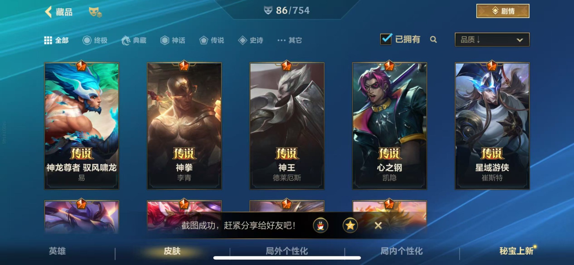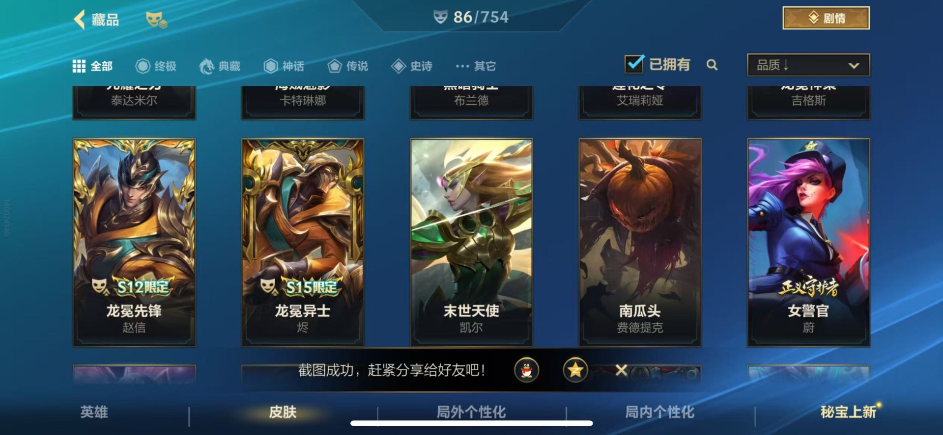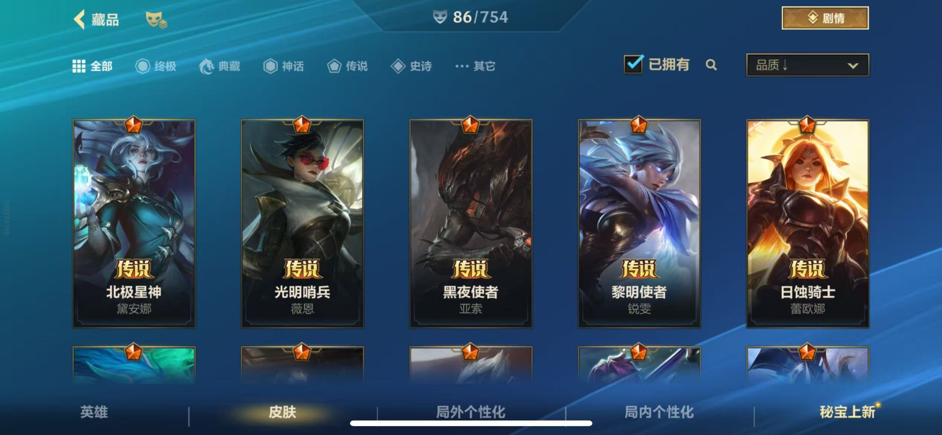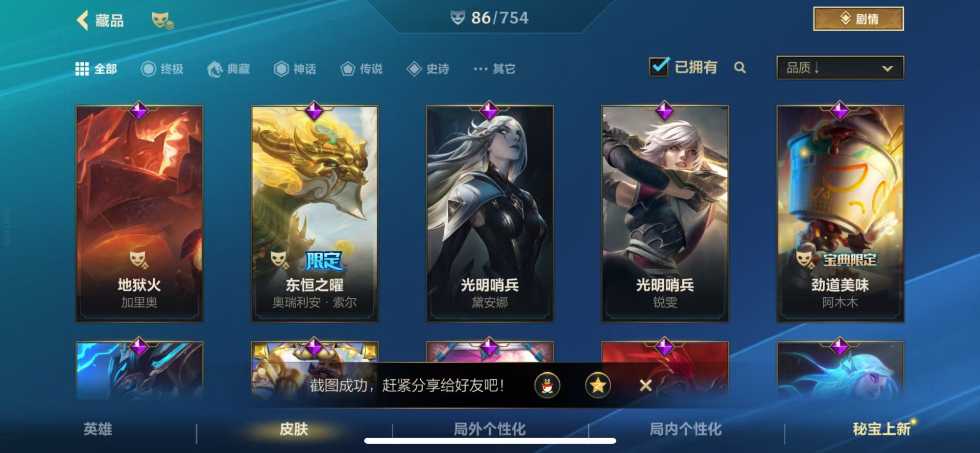 - PX_2082487-贵族等级: V5 英雄数: 120 皮肤数: 97 珍品传说: 朽木白哉,黑崎一护 星传说: 未来机甲 传说皮: 末日机甲-孙尚香,幻光神枪 限定皮: 游园惊梦,五谷丰年,鸣野蒿