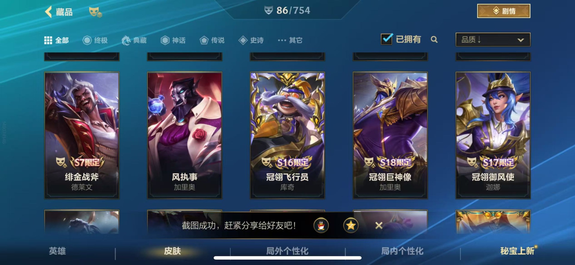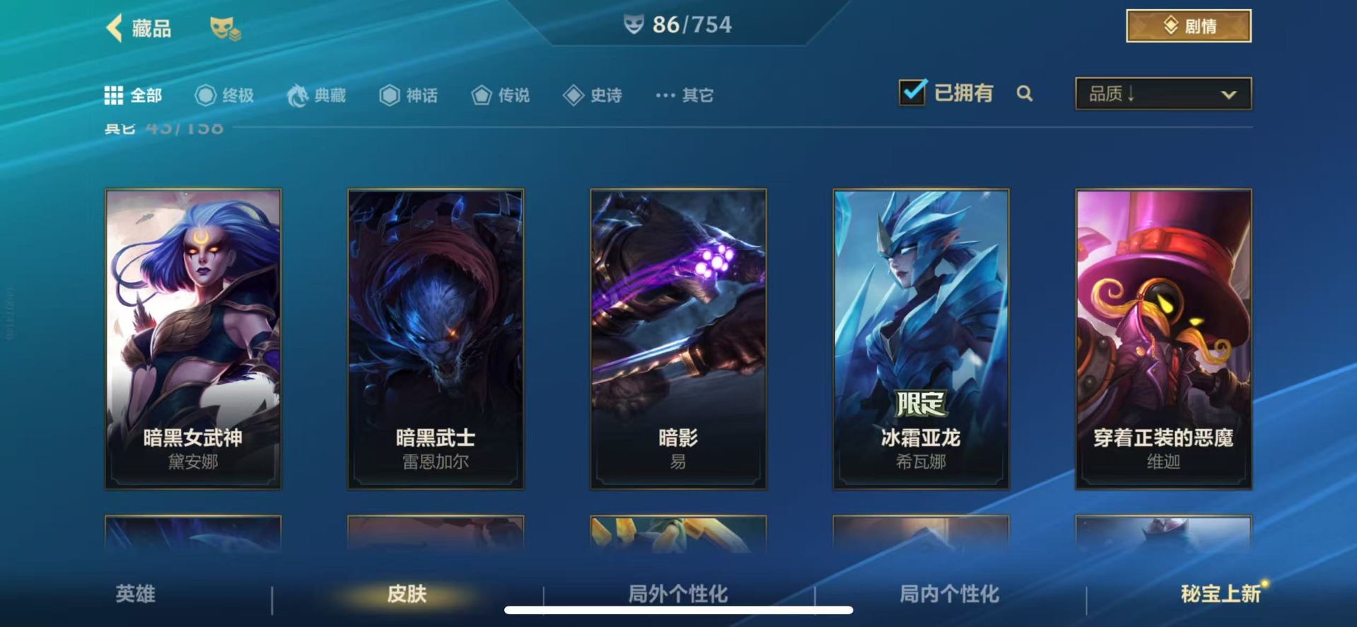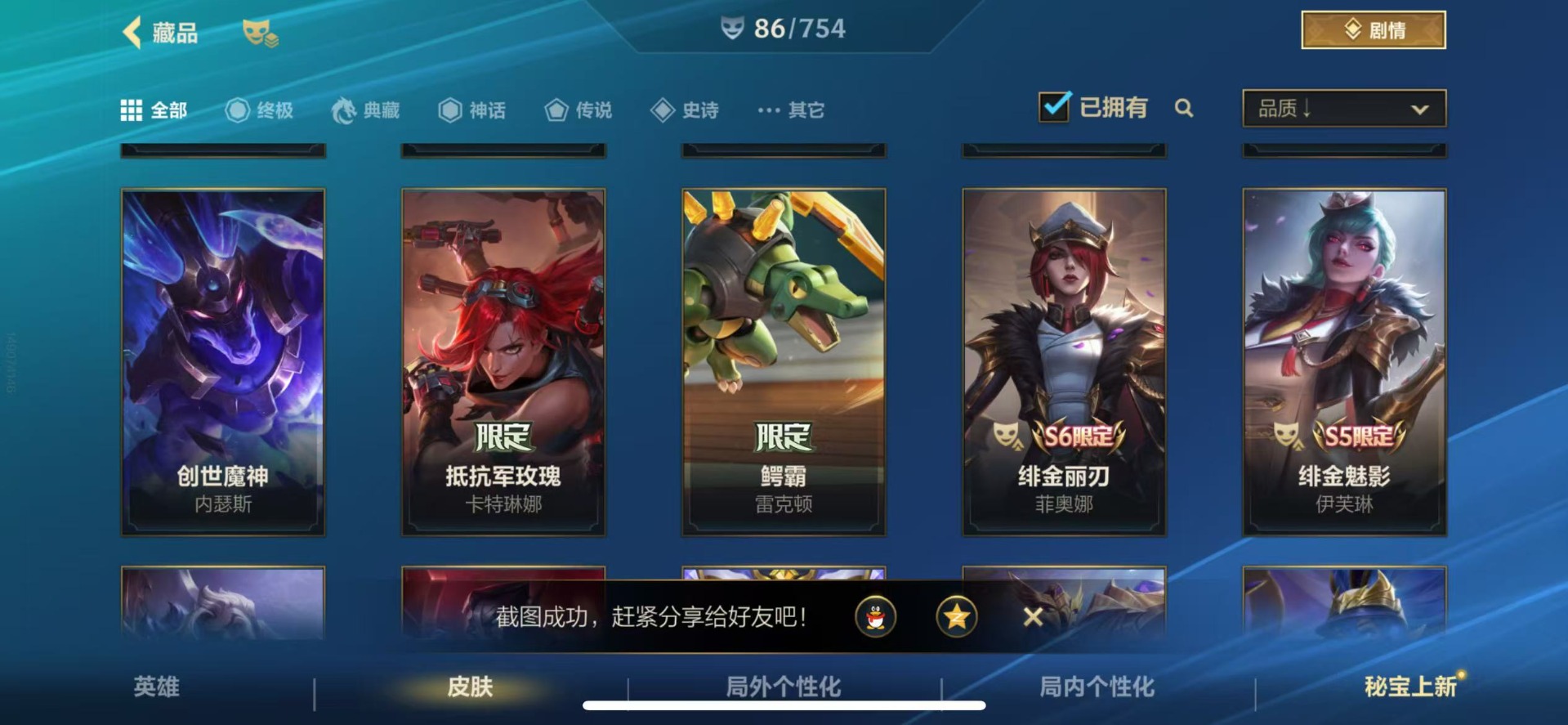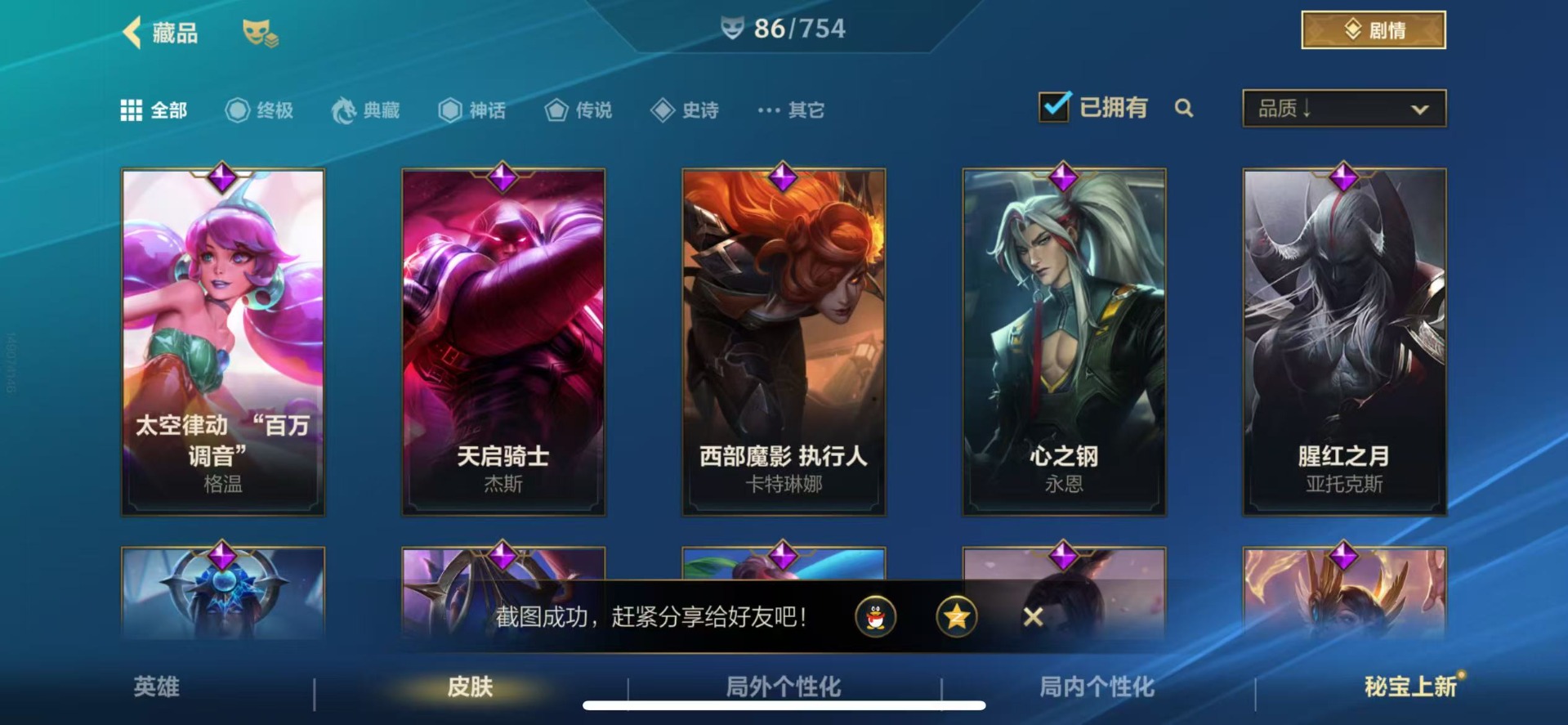 - PX_2082487-贵族等级: V5 英雄数: 120 皮肤数: 97 珍品传说: 朽木白哉,黑崎一护 星传说: 未来机甲 传说皮: 末日机甲-孙尚香,幻光神枪 限定皮: 游园惊梦,五谷丰年,鸣野蒿
