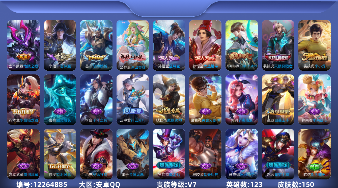 [12264885]V7 3传说 123英雄 150皮肤 可修改实名 优质装备:一念神魔,地狱之眼,涂山容容 珍宝阁皮:胡桃夹子 限定皮:至尊宝,怒海麟威,天狼狩猎者,李小龙,大圣娶亲,山海·玄木吟(马可年限) 史诗皮:黄金分割率,千年之狐,冰冠公主,节奏热浪,水果甜心,功夫厨神,幽灵船长,鬼剑武藏,纤云弄巧,水晶猎龙者,箭羽风息,金属风暴,圣诞狂欢,鹰眼统帅