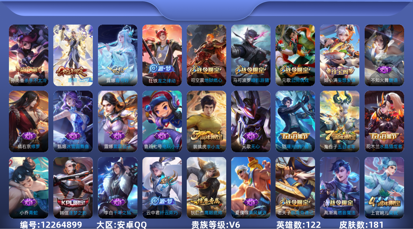 - [11900990]V7 1典藏 2珍品传说 9传说 123英雄 189皮肤 可修改实名 优质装备:拾光映像(瑶典藏),怪盗基德,大耳狗之梦,音你心动-小乔,乞巧织情,山海·琳琅生(小乔年限),小动物乐团,涂山容容 珍宝阁皮:优雅恋人,女武神 限定皮:愿照·福禄聚(蔡文姬年限),愿照·众生和(妲己年限),鸣野蒿,寅虎·展翼(孙膑年限),山海·碧波行(瑶年限),至美·化雀舞,遇见飞天,高山流水,五谷丰年,李小龙,如梦令-嫦娥,时之祈愿-瑶(瑶传限),时之奇旅-妲己 史诗皮:星界战将,石田雨龙,茶境仙,幻珠鲛人,百相守梦-黄忠,织梦人,遇见神鹿,电玩小子(小书包),千年之狐,青蛇,偶像歌手,电玩·兔顽号,电玩·爆裂旋风,暗夜猫娘,猫狗日记-孙策,猫狗日记-大乔,乱世虎臣,女仆咖啡,水果甜心,绅士熊喵,天才门将,星夜王子,心灵骇客,德古拉伯爵,幽灵船长,鬼剑武藏,舞动绿茵,地狱岩魂,纤云弄巧,拒霜思,缤纷独角兽,乘风破浪,月团寄思,水晶猎龙者,金属风暴,原初追逐者,圣诞狂欢,鹰眼统帅,魅力维加斯,赏金猎手,未来纪元-赵云