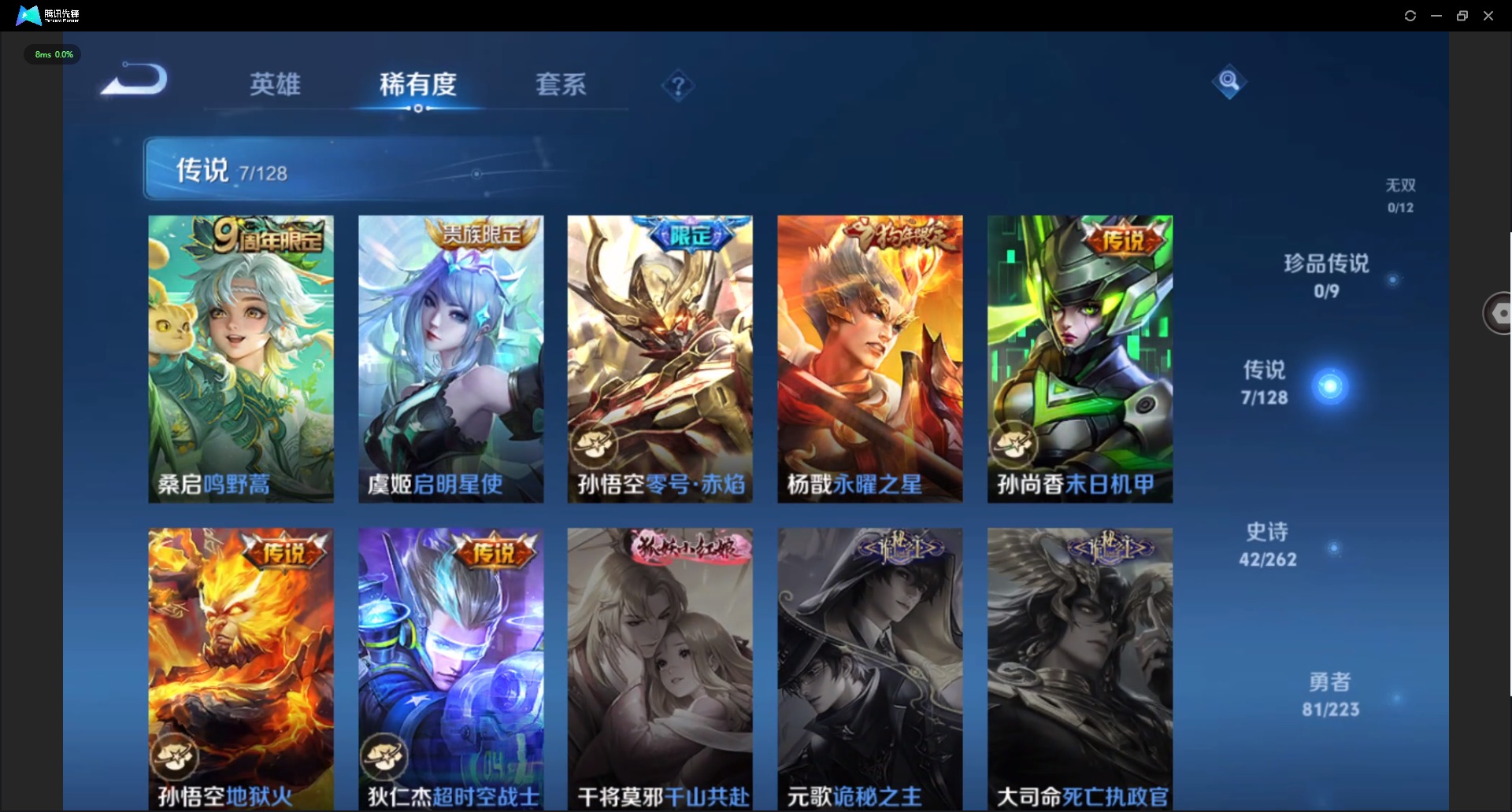 [12264918]V8 1典藏 7传说 122英雄 181皮肤 可修改实名 优质装备:全息碎影(猴子典藏),末日机甲-孙尚香(绿蚂蚱),地狱火,零号·赤焰,超时空战士-狄仁杰 限定皮:鸣野蒿,至尊宝,瑞麟志(木兰年限),逐梦之星,李小龙,朱雀志(守约年限),永曜之星,引擎之心 史诗皮:破空之剑,苍穹之光,白龙吟,黄金分割率,特工魅影,千年之狐,冰冠公主,末日机甲-吕布,猫狗日记-孙策,乱世虎臣,节奏热浪,修罗,水果甜心,星夜王子,心灵骇客,德古拉伯爵,幽灵船长,鬼剑武藏,地狱岩魂,缤纷独角兽,乘风破浪,逐浪之夏,水晶猎龙者,曙光守护者,金属风暴,原初追逐者,鹰眼统帅,未来纪元-赵云