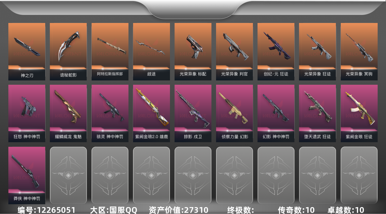 [12265051]10橙皮 10紫皮 55皮肤 17英雄 76卡面 620已用源晶 白银 优质装备:狂徒-紫阙金琅,幻影-侦察力量,戍卫-掠影,诡秘蛇影,神之刃,光荣异象,阿特拉斯指挥部,雄鹿-紫阙金琅2.0,鬼魅-耀鳞威龙 套装:神罚套装,光荣异象,神中神罚套装 佩枪皮肤:狂怒-神中神罚,标配-光荣异象 冲锋枪皮肤:骇灵-神中神罚 霰弹枪皮肤:判官-光荣异象 步枪皮肤:狂徒-创·纪元,幻影-神中神罚,狂徒-光荣异象,狂徒-堕天遗武 狙击枪皮肤:莽侠-神中神罚,冥驹-光荣异象