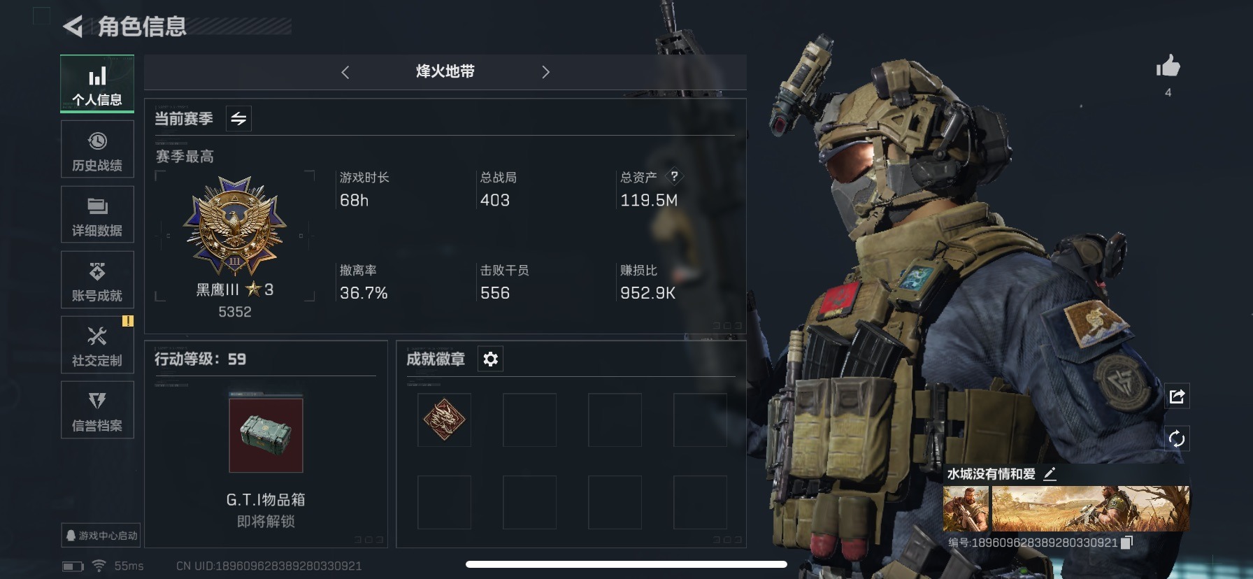 [12265054]总资产:119.5M 11传说枪械 哈夫币:23.189K 高级安全箱(9.16到期) 可二次 可修改实名 烽火地带段位:黑鹰 全面战场段位:无段位 传说武器皮肤:UZI冲锋枪-特斯拉线圈,M16A4突击步枪-狩猎时刻,AK-12突击步枪-特斯拉线圈,SR-3M紧凑突击步枪-特斯拉线圈,勇士冲锋枪-能天使-午夜邮差,Vector冲锋枪-狩猎时刻,G3战斗步枪-狩猎时刻,复合弓-黑-天际线,725双管霰弹枪-送葬人-无题密令,M4A1突击步枪-阿米娅,CAR-15突击步枪-阿米娅 史诗武器皮肤:QJB201轻机枪-Old Habits,M16A4突击步枪-竞赛选手,M250通用机枪-囚徒,AS Val突击步枪-典狱官,PSG-1射手步枪-无垢,SR-3M紧凑突击步枪-荒野求生,PKM通用机枪-荒野求生,Vector冲锋枪-阿萨拉文明