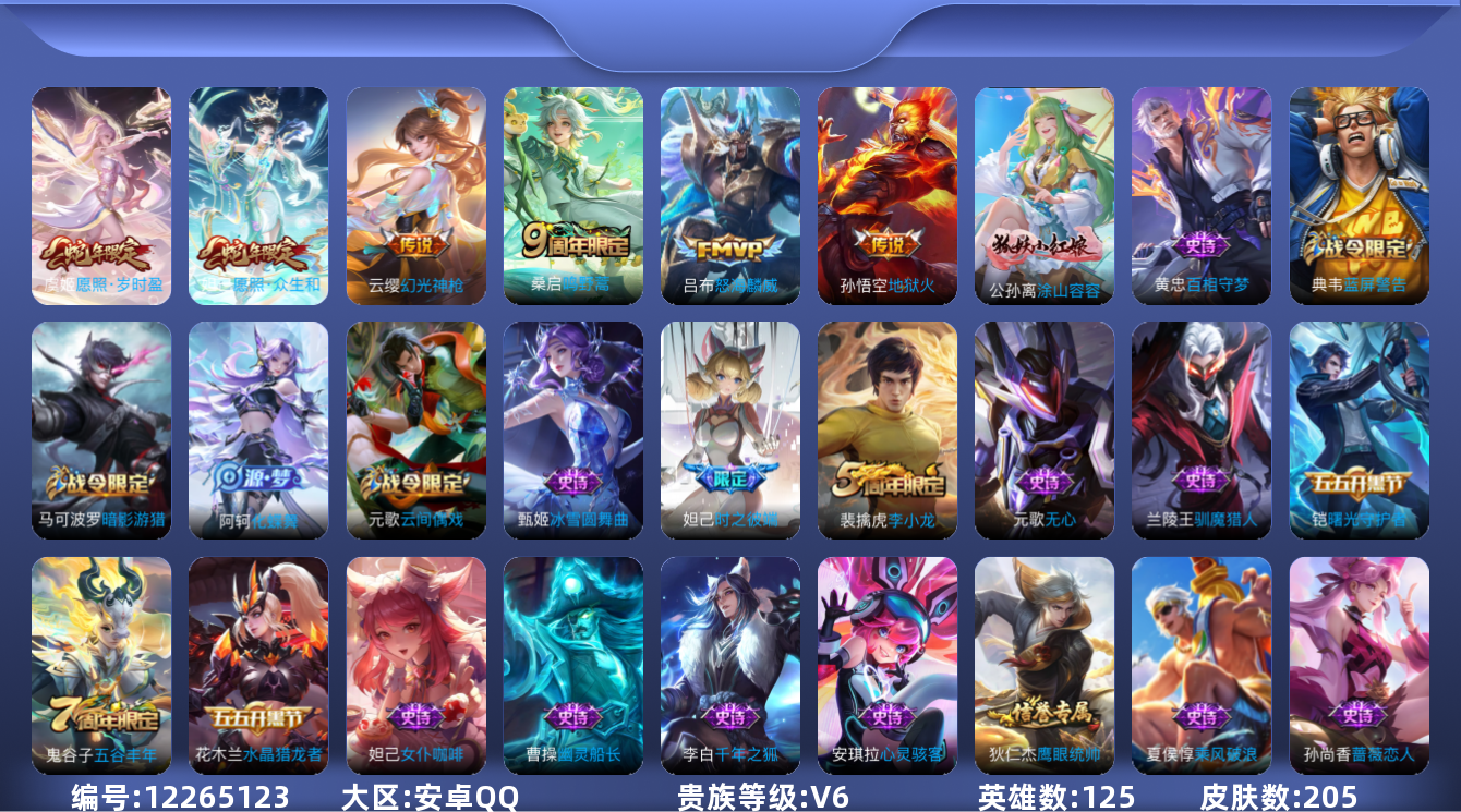 [12265123]V6 6传说 125英雄 205皮肤 可修改实名 优质装备:地狱火,涂山容容 传说皮:幻光神枪 珍宝阁皮:优雅恋人,蔷薇恋人 限定皮:愿照·岁时盈(虞姬年限),愿照·众生和(妲己年限),鸣野蒿,时之彼端,遇见飞天,怒海麟威,五谷丰年,梁祝,李小龙 史诗皮:化蝶舞,百相守梦-黄忠,特工魅影,千年之狐,偶像歌手,乱世虎臣,节奏热浪,女仆咖啡,摇滚巨星,水果甜心,绅士熊喵,天才门将,星夜王子,心灵骇客,功夫厨神,德古拉伯爵,暗隐猎兽者,幽灵船长,鬼剑武藏,心灵战警,地狱岩魂,诗语江南,繁星吟游(呼啦呼啦),缤纷独角兽,乘风破浪,水晶猎龙者,曙光守护者,箭羽风息,圣诞狂欢,圣诞恋歌,鹰眼统帅,魅力维加斯,无心,未来纪元-赵云