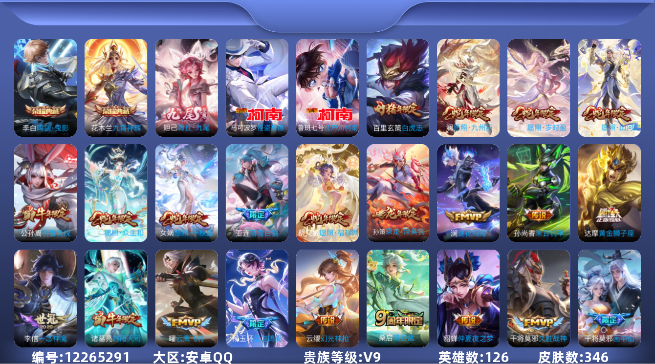 [12265291]V9 2典藏 1无双 2珍品传说 32传说 126英雄 346皮肤 典藏英雄武则天 可修改实名 马可波罗小国标 优质装备:鸣剑·曳影,九霄神辉(木兰典藏),青丘·九尾(妲己无双),江户川柯南,怪盗基德,黄金狮子座,冠军飞将,云鹰飞将(小将军),猫影幻舞,久胜战神,一念神魔,末日机甲-孙尚香(绿蚂蚱),地狱火,仲夏夜之梦(大飞蛾),海洋之心,胖达荣荣,超时空战士-狄仁杰,音你闪耀(rap皮),画中仙,青丘·九尾,惊梅引,澜逐花归海 传说皮:乘龙·淬吴钩(孙策年限),落雪白狼,星之鸣奏,幻光神枪 珍宝阁皮:万物之道,优雅恋人 限定皮:愿照·九州拓(澜年限),愿照·福禄聚(蔡文姬年限),愿照·岁时盈(虞姬年限),愿照·山河定(司空震年限),愿照·众生和(妲己年限),愿照·千秋盛(女娲年限),逐霄战戟,陌上桑,鸣野蒿,至尊宝,白虎志(电光耗子),时雨天司(水龙头),飞衡(韩信年限),影龙天霄,高山流水,青龙志(铠年限),梁祝,御风骁将(吕布年限),祈雪灵祝(雪兔子),李小龙,默契交锋-花木兰,孙行者,大圣娶亲,引擎之心 史诗皮:鸭鸭历险记-刘禅,器灵·浮梦炉,糖绘人间,狼魂孤将,化蝶舞,藏狐·褐绒,茶境仙,炽弈燎原,破空之剑,蔬乡物语(鲁班七号),百相守梦-百里守约,星界特工,紫霞仙子,电玩小子(小书包),黄金分割率,特工魅影,千年之狐,江河有灵,魅语,高渐离燃音魔法,蒙恬荣光圣徽,冰冠公主,青蛇,偶像歌手,白蛇,百相守梦(刘备),银翎春语,龙骑士(小龙虾),末日机甲-吕布,乱世虎臣,节奏热浪,修罗,女仆咖啡,摇滚巨星,水果甜心,绅士熊喵,星夜王子,心灵骇客,时之奇旅-安琪拉,德古拉伯爵,暗隐猎兽者,鬼剑武藏,暗渊魔法,心灵战警,乐园奇幻夜,舞动绿茵,地狱岩魂,纤云弄巧,繁星吟游(呼啦呼啦),缤纷独角兽,乘风破浪,逐浪之夏,水晶猎龙者,箭羽风息,金属风暴,原初追逐者,圣诞恋歌,鹰眼统帅,暗夜贵公子,魅力维加斯,黎明之约,无心,未来纪元-赵云