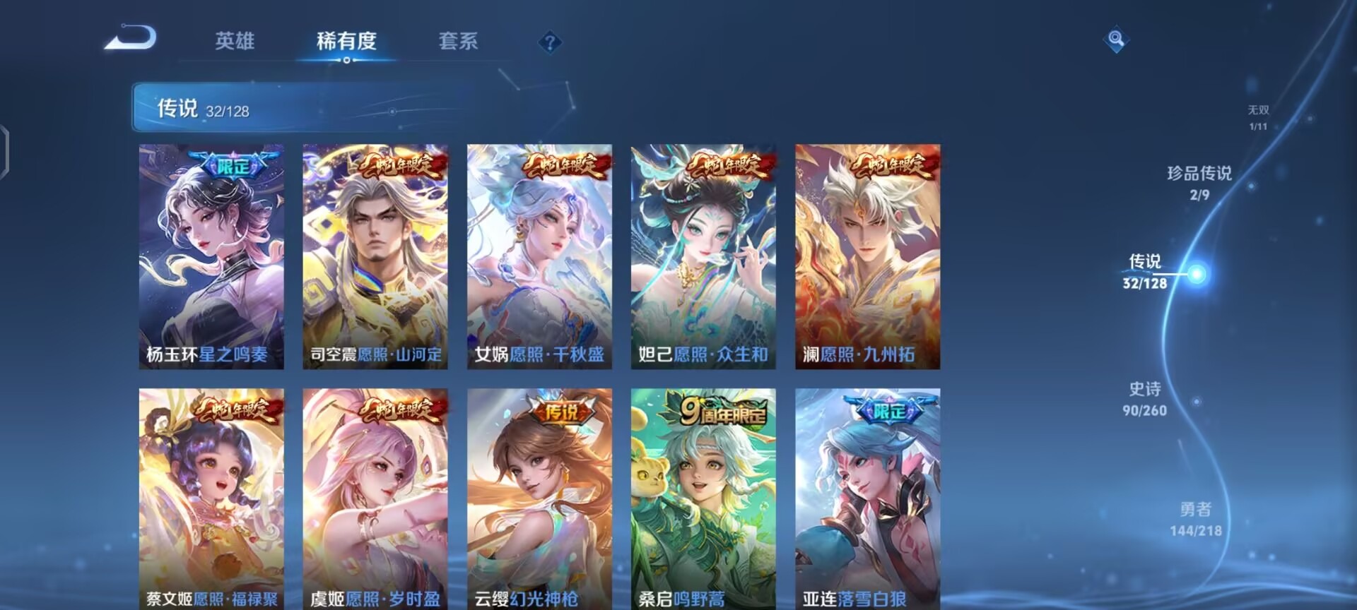 铠青龙志,吕布御风骁将,诸葛亮时雨天司,公孙离祈雪灵祝,司空震愿照·山河定,兰陵王影龙天霄,裴擒虎李小龙,上官婉儿梁祝,花木兰默契交锋,艾琳陌上桑,桑启鸣野蒿,女娲愿照·千秋盛,孙悟空孙行者,孙悟空大圣娶亲,孙悟空至尊宝,百里玄策白虎志,赵云引擎之心,妲己愿照·众生和,韩信飞衡,蔡文姬愿照·福禄聚,澜愿照·九州拓,虞姬愿照·岁时盈