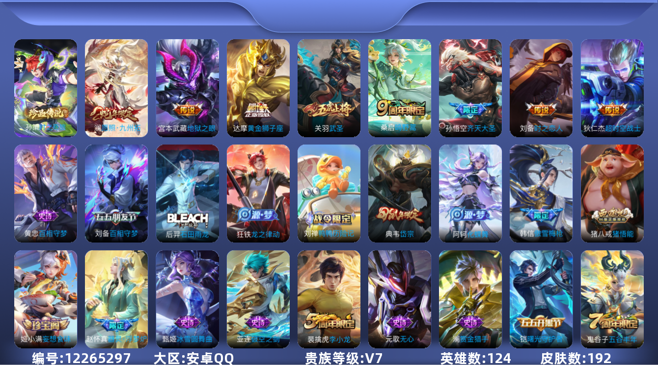 [12265297]实名: 可修改 贵族等级: V7 英雄数: 124 皮肤数: 192 珍品传说: 时之奇旅-孙策 传说皮: 黄金狮子座,地狱之眼,时之恋人-刘备,超时空战士-狄仁杰 限定皮: 李小龙,武圣,岱宗,高山流水,猪悟能,傲雪梅枪,五谷丰年,齐天大圣,鸣野蒿,愿照·九州拓
