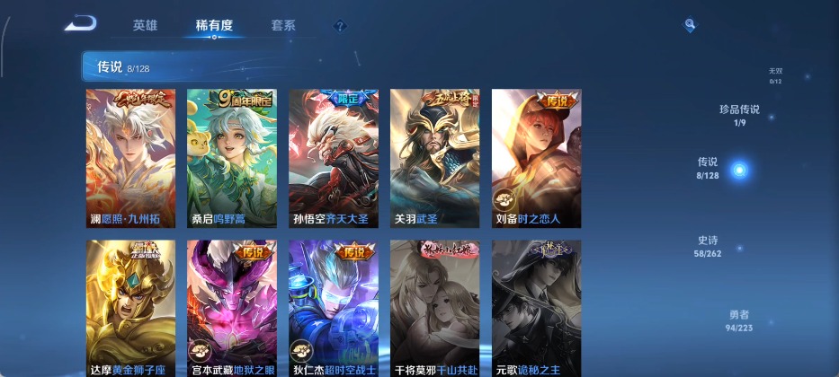 - PX_2109913-Q/非凡王者/346皮肤/125英雄/2典藏/0珍品无双/0无双/1珍品传说/26传说/102史诗/9稀有英雄 【1 珍品传说】怪盗基德 马可波罗, 【2 典藏皮肤】弑枪猎影 韩信,星域神启 诸葛亮, 【26 传说皮肤】枫霜尽 橘右京,胖达荣荣 梦奇,启明星使 虞姬,逐花归海 澜,无双飞将 马超,李逍遥 曜,云鹰飞将 曜,深海之息 马可波罗,诗剑行 李白,地狱之眼 宫本武藏