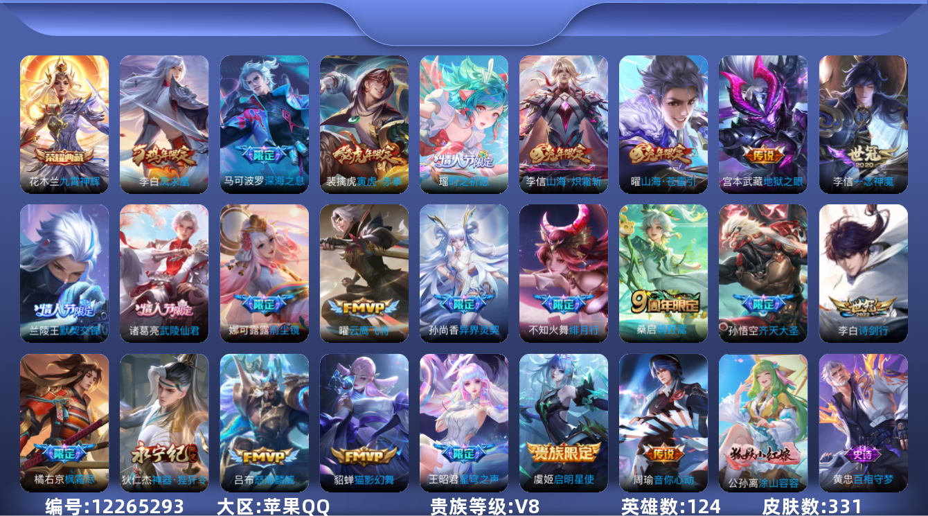 [12265293]V8 1典藏 24传说 124英雄 331皮肤 可修改实名 优质装备:九霄神辉(木兰典藏),云鹰飞将(小将军),猫影幻舞,一念神魔,地狱之眼,音你心动-周瑜,神器·狴犴令,山海·炽霜斩(李信年限),山海·苍雷引(电光曜子),涂山容容 珍宝阁皮:蔷薇恋人,女武神,玩趣恶龙 限定皮:鸣野蒿,至尊宝,凤求凰(白切鸡),武陵仙君(小桃花),异界灵契(白毛香),傲雪梅枪,前尘镜,星穹之声,绯月行,飞衡(韩信年限),遇见飞天,高山流水,诗剑行,齐天大圣,怒海麟威,降魔,五谷丰年,游园惊梦,梁祝,御风骁将(吕布年限),天狼狩猎者,龙胆,岱宗(典韦年限),天狼溯光者,李小龙,如梦令-后羿,默契交锋-兰陵王,默契交锋-花木兰,孙行者,乒乒小将,寅虎·赤拳(老虎年限),时之祈愿-云中君,时之祈愿-瑶(瑶传限),深海之息(深海大菠萝),枫霜尽,时之奇旅-妲己 史诗皮:化蝶舞,雪豹·霜爪,石田雨龙,百相守梦-黄忠,紫霞仙子,苍穹之光,电玩小子(小书包),白龙吟,黄金分割率,特工魅影,千年之狐,江河有灵,冰冠公主,暗夜猫娘,末日机甲-吕布,猫狗日记-孙策,猫狗日记-大乔,乱世虎臣,节奏热浪,女仆咖啡,摇滚巨星,水果甜心,绅士熊喵,天才门将,星夜王子,心灵骇客,功夫厨神,德古拉伯爵,暗隐猎兽者,幽灵船长,鬼剑武藏,心灵战警,舞动绿茵,地狱岩魂,繁星吟游(呼啦呼啦),缤纷独角兽,乘风破浪,逐浪之夏,水晶猎龙者,曙光守护者,箭羽风息,唤灵魅影,金属风暴,圣诞狂欢,圣诞恋歌,鹰眼统帅,暗夜贵公子,魅力维加斯,赏金猎手,无心,未来纪元-赵云