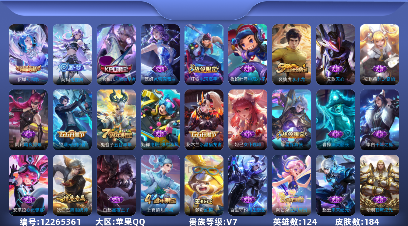 - [12165142]V7 1典藏 1珍品传说 9传说 125英雄 267皮肤 可修改实名 优质装备:九霄神辉(木兰典藏),江户川柯南,黄金射手座,云鹰飞将(小将军),零号·赤焰,无双飞将,山海·炽霜斩(李信年限),涂山容容 传说皮:幻光神枪 珍宝阁皮:万物之道,优雅恋人,女武神 限定皮:愿照·岁时盈(虞姬年限),愿照·千秋盛(女娲年限),逐霄战戟,陌上桑,鸣野蒿,高山流水,五谷丰年,梁祝,孙行者 史诗皮:鸭鸭历险记-刘禅,器灵·浮梦炉,化蝶舞,星界战将,谪仙醉月,龙之律动,石田雨龙,茶境仙,怒海争锋,炽弈燎原,破空之剑,战舞者,芈月浮光幕影,琥珀纪元伽罗,蔬乡物语(鲁班七号),百相守梦-百里守约,星界特工,百相守梦-黄忠,紫霞仙子,电玩小子(小书包),黄金分割率,特工魅影,魅语,百解令(蒙犽),高渐离燃音魔法,蒙恬荣光圣徽,偶像歌手,电玩·爆裂旋风,末日机甲-吕布,猫狗日记-孙策,猫狗日记-大乔,乱世虎臣,节奏热浪,修罗,女仆咖啡,水果甜心,天才门将,星夜王子,心灵骇客,功夫厨神,德古拉伯爵,暗隐猎兽者,幽灵船长,鬼剑武藏,心灵战警,天秀·启明,舞动绿茵,地狱岩魂,纤云弄巧,拒霜思,缤纷独角兽,乘风破浪,逐浪之夏,水晶猎龙者,曙光守护者,金属风暴,原初追逐者,圣诞狂欢,圣诞恋歌,鹰眼统帅,暗夜贵公子,魅力维加斯,黎明之约,赏金猎手,无心,未来纪元-赵云