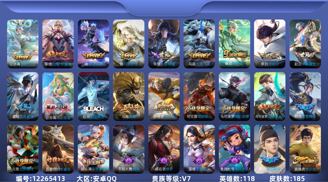 - [11228385]V7 6传说 123英雄 176皮肤 可修改实名 传说皮:零号·赤焰,地狱火,末日机甲-孙尚香(绿蚂蚱),炽阳神光,飞鸢探春,绛天战甲(鸡嘴战神) 珍宝阁皮:优雅恋人 限定皮:至尊宝,瑞麟志(木兰年限),遇见飞天,高山流水,青龙志(铠年限),游园惊梦,梁祝,御风骁将(吕布年限),李小龙,朱雀志(守约年限),如梦令-后羿,孙行者,猪悟能,大圣娶亲 史诗皮:千年之狐,永昼,猫狗日记-孙策,乱世虎臣,摇滚巨星,水果甜心,星夜王子,心灵骇客,暗隐猎兽者,幽灵船长,纤云弄巧,繁星吟游(呼啦呼啦),缤纷独角兽,乘风破浪,逐浪之夏,金属风暴,圣诞狂欢,圣诞恋歌,鹰眼统帅,魅力维加斯,无心