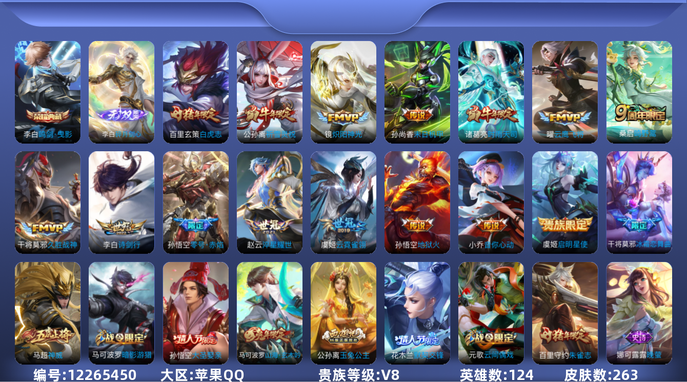 [12265450]V8 1典藏 1无双 15传说 124英雄 263皮肤 可修改实名 优质装备:鸣剑·曳影,碎月剑心(李白无双),云鹰飞将(小将军),久胜战神,炽阳神光,云霓雀翎,末日机甲-孙尚香(绿蚂蚱),地狱火,音你心动-小乔,零号·赤焰,淬星耀世 珍宝阁皮:优雅恋人,玩趣恶龙 限定皮:鸣野蒿,白虎志(电光耗子),时雨天司(水龙头),神威(电光马子),遇见飞天,诗剑行,五谷丰年,梁祝,祈雪灵祝(雪兔子),李小龙,朱雀志(守约年限),霸王别姬-虞姬,默契交锋-花木兰,大圣娶亲,冰霜恋舞曲,玉兔公主,山海·玄木吟(马可年限) 史诗皮:紫霞仙子,苍穹之光,电玩小子(小书包),白龙吟,黄金分割率,特工魅影,千年之狐,永昼,江河有灵,百解令(蒙犽),魅语,无限星赏官,晚萤,偶像歌手,龙骑士(小龙虾),末日机甲-吕布,猫狗日记-孙策,时之恋人-孙尚香,乱世虎臣,节奏热浪,修罗,摇滚巨星,水果甜心,绅士熊喵,星夜王子,心灵骇客,功夫厨神,德古拉伯爵,暗隐猎兽者,幽灵船长,鬼剑武藏,地狱岩魂,纤云弄巧,繁星吟游(呼啦呼啦),拒霜思,缤纷独角兽,乘风破浪,逐浪之夏,水晶猎龙者,曙光守护者,箭羽风息,金属风暴,原初追逐者,圣诞狂欢,圣诞恋歌,鹰眼统帅,暗夜贵公子,魅力维加斯,黎明之约,赏金猎手,无心,未来纪元-赵云,玫瑰异探