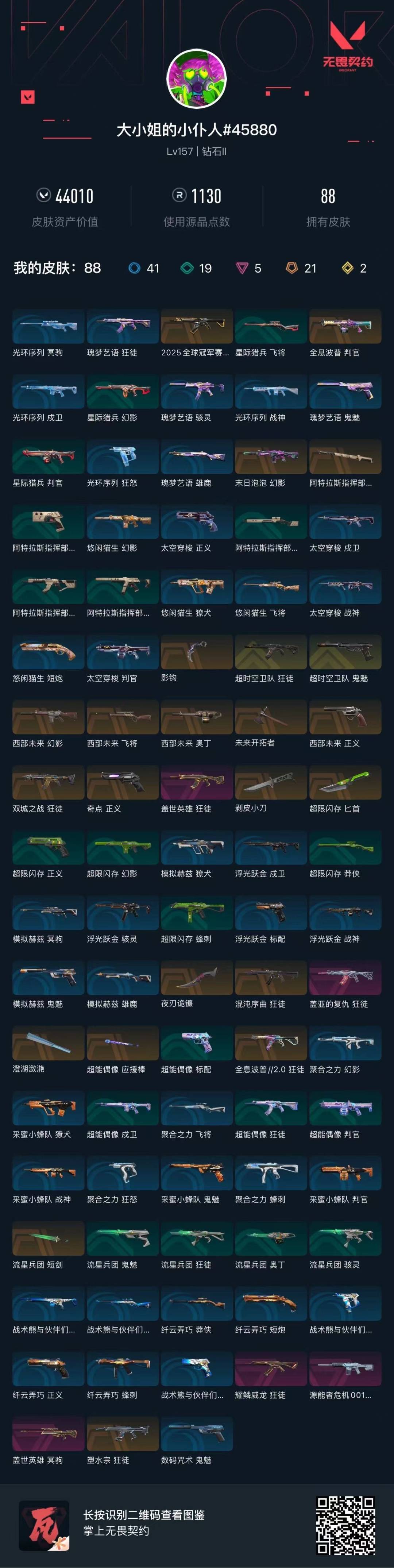 [12265535]21橙皮 2金皮 5紫皮 88皮肤 26英雄 127卡面 1130已用源晶 钻石 优质装备:正义-奇点,狂徒-塑水宗,狂徒-混沌序曲,狂徒-盖亚的复仇,狂徒-全息波普//2.0,澄湖潋滟,狂徒-盖世英雄,剥皮小刀,判官-全息波普,狂徒-耀鳞威龙,幻影-源能者危机001,夜刃诡镰,匕首-超限闪存,未来开拓者,阿特拉斯指挥部,影钩,幻影-末日泡泡,2025全球冠军赛 狂徒 套装:西部未来 佩枪皮肤:鬼魅-超时空卫队,正义-西部未来 步枪皮肤:幻影-西部未来,狂徒-双城之战,狂徒-超时空卫队 狙击枪皮肤:飞将-西部未来,冥驹-盖世英雄 机枪皮肤:奥丁-西部未来 近战武器皮肤:短剑-流星兵团,超能偶像 应援棒
