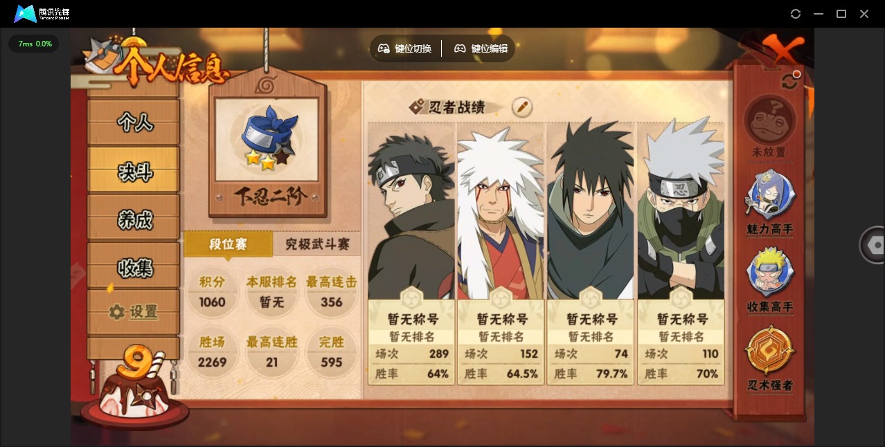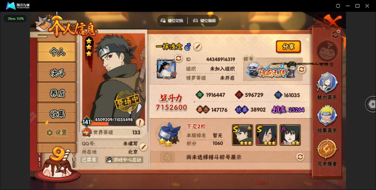 [12265542]V9 11S忍 27A忍 15通灵 715.2W战力 可二次 可修改实名 优质装备:宇智波带土 「忍界大战」,宇智波佐助「永恒万花筒」,宇智波斑「秽土转生·解」,艾「忍界大战」,宇智波止水「须佐能乎」,旗木卡卡西「须佐能乎」 S级忍者:自来也 「舞之豪杰」,宇智波鼬 「须佐能乎」,佩恩「天道」,波风水门,自来也