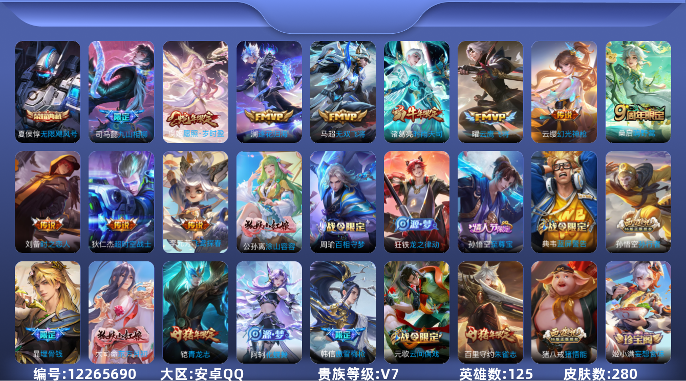 [12265690]V7 1典藏 11传说 125英雄 280皮肤 可修改实名 优质装备:无限飓风号(高达),云鹰飞将(小将军),飞鸢探春,时之恋人-刘备(电焊工),超时空战士-狄仁杰,无双飞将,澜逐花归海,涂山容容 传说皮:九山相柳,幻光神枪 珍宝阁皮:妄想食味,优雅恋人 限定皮:愿照·岁时盈(虞姬年限),逐霄战戟,鸣野蒿,至尊宝,傲雪梅枪,时雨天司(水龙头),高山流水,五谷丰年,青龙志(铠年限),梁祝,李小龙,朱雀志(守约年限),孙行者,猪悟能 史诗皮:化蝶舞,龙之律动,百相守梦-周瑜,茶境仙,怒海争锋,破空之剑,东方月初,埋骨钱,芈月浮光幕影,蔬乡物语(鲁班七号),百相守梦-百里守约,紫霞仙子,白龙吟,黄金分割率,特工魅影,千年之狐,江河有灵,冰冠公主,青蛇,偶像歌手,末日机甲-吕布,猫狗日记-孙策,时之恋人-孙尚香,乱世虎臣,节奏热浪,修罗,女仆咖啡,水果甜心,心灵骇客,功夫厨神,暗隐猎兽者,幽灵船长,鬼剑武藏,心灵战警,舞动绿茵,地狱岩魂,纤云弄巧,缤纷独角兽,乘风破浪,逐浪之夏,月团寄思,水晶猎龙者,曙光守护者,箭羽风息,金属风暴,圣诞狂欢,圣诞恋歌,鹰眼统帅,无心,未来纪元-赵云