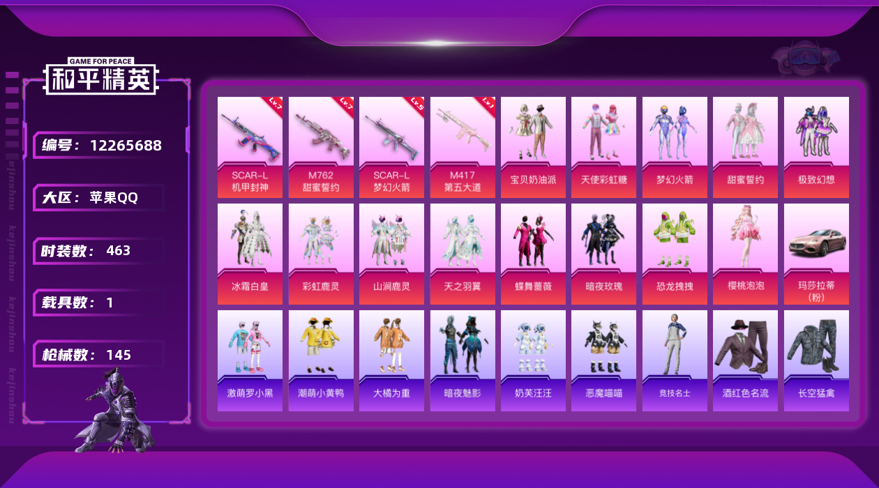 [12265688]13粉装 4特效枪 1载具 9印记 可二次 可修改实名 优质装备:玛莎拉蒂Ghibli(粉),M762甜蜜誓约,SCAR-L梦幻火箭,梦幻火箭(新101)(新火箭少女101粉色套装),宝贝奶油派,天使彩虹糖,甜蜜誓约,极致幻想,冰霜白皇,SCAR-L机甲封神,M417第五大道,七级SCAR-L-机甲封神,七级M762-甜蜜誓约,樱桃泡泡 热门装扮:蝶舞蔷薇,彩虹鹿灵,山涧鹿灵,天之羽翼,恐龙拽拽,暗夜玫瑰,奶芙汪汪,激萌罗小黑,恶魔喵喵,大橘为重,潮萌小黄鸭,暗夜魅影 五级特效枪:五级SCAR-L-梦幻火箭 一级特效枪:一级M417-第五大道 紫色装扮:田园牧歌,轻风白浪,SS22特训,SS23特训,幻彩翩翩,妙红点点,香榭午后,娇憨猪猪,俏皮奶喵,萌趣咩咩,SS21特训,SS31特训套装,SS5特训,人气偶像,冰川特警,5.56爱好者,SS20特训,SS15特训,极速先驱,时空追击者,暴风机械师,SS16特训,SS13特训,浪漫樱花,治愈之星,科技之星,SS14特训,萌趣颜团子,特种颜团子,猎梦纪元,茉莉之诺,飞驰魅影,音速流光,SS19特训,豚鼠丹丹,吉莉礼服,甜心亚梦,虚音幻奏,雪兔飞飞,瑞龙福将,团圆交子,醒狮腾龙,SS17特训,炫光向阳,沁蓝冰爽,SS18特训,都市魅力,酒红色名流,酷萌兔限定,长空猛禽,雪山精英,耀眼新星,虎虎生威吉莉,街头潮人,飞行日记,魅力单车,鹤鸣,麻辣教官,龙的传人,龟仙人,极地朋克,柠萌假日,深蓝色名流,滨海假日,幻影武者,圣诞大吉,夏日音浪,幻世战舞者,探宝勇士,滨海厨神,疯狂小兔子,白熊同盟,破蛋小黄鸡,福星高照,竞技达人朋克,甜蜜熊情侣,牛气冲天,灼焰舞者,炫蓝之夏,燃烧卡路里,牛气满满,特战装甲,鱼渊荷华,玉兔迎春,燕燕于飞,竞技名士,SS24特训(SS24特训套装),SS25特训,粉红小猪,SS6特训,五号元素,玄武圣者,粉甜马卡龙,原初圣火,逆风勇士,SS12特训,薄荷蓝莓,辉星之火,纯白誓言,智慧之神,暗夜契约,本愿之火,SS11特训,耀粉歌者,SS32特训服(SS32特训套装),风舞幻音,萌黄之夏,恋语绒绒,WiFi精灵 优质战备:恐龙拽拽降落伞,彩虹独角兽飞行器,樱桃泡泡降落伞,月下星之子飞行器,彩虹独角兽降落伞,彩虹甜喵降落伞,垂柳戏鸭降落伞,炫光之旅降落伞,第五大道降落伞,百万伏特降落伞,甜心宝贝降落
