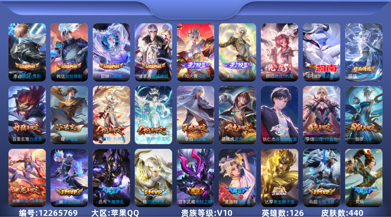[12265769]V10 4典藏 3无双 2珍品传说 52传说 126英雄 440皮肤 典藏英雄武则天 可修改实名 优质装备:鸣剑·曳影,星域神启(倪克斯贼亮),幻阙歌(貂蝉典藏),弑枪猎影(韩信典藏),青丘·九尾(妲己无双),碎月剑心(李白无双),花合斗,怪盗基德,器灵·落星盏,黄金狮子座,黄金射手座,绛天战甲(鸡嘴战神),黄金白羊座,猫影幻舞,炽阳神光,仲夏夜之梦(大飞蛾),音你心动-小乔,零号·赤焰,海洋之心,地狱之眼,飞鸢探春,音你心动-周瑜,胖达荣荣,李逍遥,时之恋人-刘备(电焊工),淬星耀世,超时空战士-狄仁杰,花朝如约(花篮子),无双飞将,山海·炽霜斩(李信年限),山海·琳琅生(小乔年限),浮生妄,青丘·九尾,百相守梦(张飞),电玩·雷克斯,鹤羽星尊,灼幽烈阳,永恒水手月亮,夜礼服假面,小动物乐团,澜逐花归海,艾琳觅芳踪,云中君群星魔术团,涂山容容 传说皮:乘龙·淬吴钩(孙策年限),幻光神枪 珍宝阁皮:胡桃夹子,女武神 限定皮:愿照·九州拓(澜年限),愿照·众生和(妲己年限),鸣野蒿,至尊宝,白虎志(电光耗子),凤求凰(白切鸡),太华(伽罗年限),异界灵契(白毛香),傲雪梅枪,补天,前尘镜,星穹之声,神威(电光马子),飞衡(韩信年限),遇见飞天,诗剑行,怒海麟威,五谷丰年,青龙志(铠年限),冰锋战神,岱宗(典韦年限),天狼绘梦者,李小龙,玄武志(苏烈年限),朱雀志(守约年限),霸王别姬-虞姬,大圣娶亲,天魔缭乱,青春决赛季,云端筑梦师,热情桑巴,美猴王,寅虎·赤拳(老虎年限),无尽星芒,唐三藏,枫霜尽,匿光启智者,梦圆繁星 史诗皮:鸭鸭历险记-刘禅,化蝶舞,灵蛊蚀心,星界战将,龙之律动,石田雨龙,茶境仙,炽弈燎原,破空之剑,战舞者,涂山红红,东方月初,蒙犽顽岩魄,琥珀纪元伽罗,上官婉儿群星魔术团,蔬乡物语(鲁班七号),曹操夜都魔契,百相守梦-百里守约,百相守梦-黄忠,织梦人,遇见神鹿,紫霞仙子,苍穹之光,电玩小子(小书包),黄金分割率,特工魅影,千年之狐,永昼,江河有灵,雪夜绮愿(周瑜),百解令(蒙犽),高渐离燃音魔法,蒙恬荣光圣徽,无限星赏官,匿光破解者,冰冠公主,偶像歌手,晚萤,暗夜猫娘,银翎春语,龙骑士(小龙虾),末日机甲-吕布,猫狗日记-孙策,猫狗日记-大乔,乱世虎臣,节奏热浪,女仆咖啡,摇滚巨星,水果甜心,绅士熊喵,天才门将,星夜王子,心灵骇客,功夫厨神