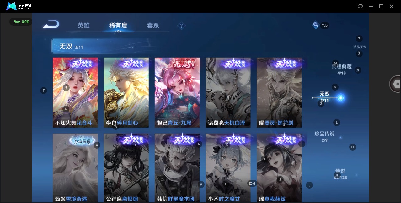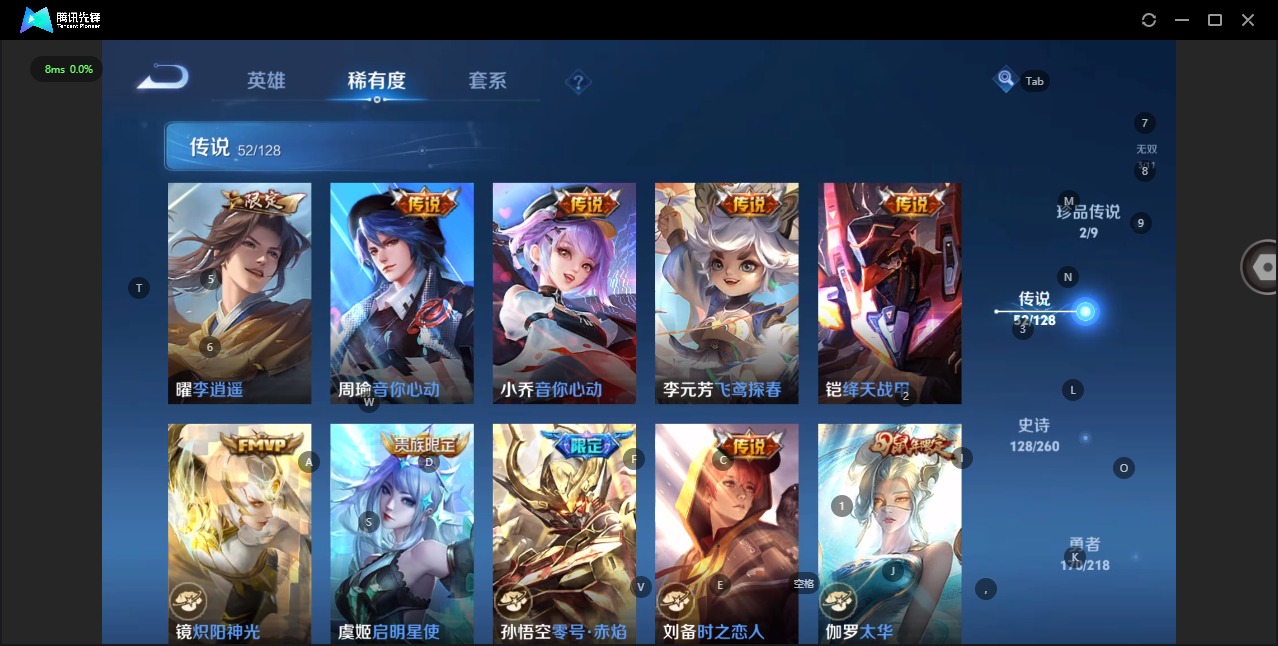 - PX_2089954-35 安卓QQ/至尊星耀/257皮肤/124英雄/1典藏/0珍品无双/0无双/2珍品传说/15传说/81史诗/9稀有英雄 【2 珍品传说】怪盗基德 马可波罗,器灵·落星盏 嫦娥, 【1 典藏皮肤】弑枪猎影 韩信, 【15 传说皮肤】启明星使 虞姬,云霓雀翎 虞姬,零号·赤焰 孙悟空,地狱火 孙悟空,记忆之芯 公孙离,时雨天司 诸葛亮,霜月吟 露娜,绛天战甲 铠,妄想实况 马可