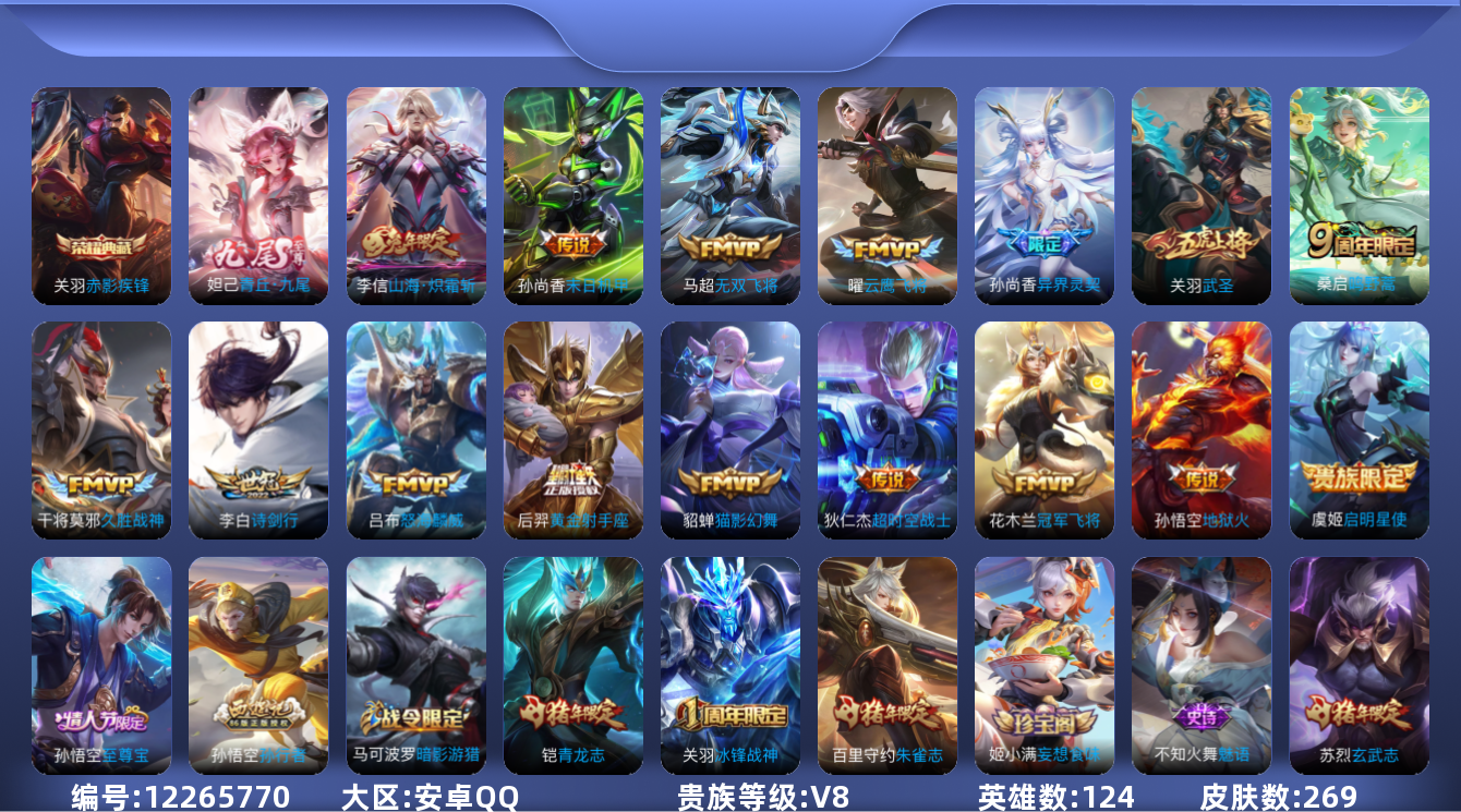 [12265770]V8 1典藏 1无双 16传说 124英雄 269皮肤 可修改实名 优质装备:赤影疾锋,青丘·九尾(妲己无双),黄金射手座,冠军飞将,云鹰飞将(小将军),猫影幻舞,久胜战神,末日机甲-孙尚香(绿蚂蚱),地狱火,超时空战士-狄仁杰,无双飞将,山海·炽霜斩(李信年限),青丘·九尾 珍宝阁皮:妄想食味,优雅恋人,蔷薇恋人 限定皮:鸣野蒿,至尊宝,异界灵契(白毛香),瑞麟志(木兰年限),遇见飞天,高山流水,诗剑行,怒海麟威,五谷丰年,青龙志(铠年限),冰锋战神,武圣,梁祝,龙胆,李小龙,玄武志(苏烈年限),朱雀志(守约年限),孙行者 史诗皮:破空之剑,蒙犽顽岩魄,决胜骁骑,电玩小子(小书包),黄金分割率,特工魅影,魅语,无限星赏官,冰冠公主,百相守梦(关羽),末日机甲-吕布,猫狗日记-孙策,猫狗日记-大乔,时之恋人-孙尚香,乱世虎臣,节奏热浪,修罗,女仆咖啡,摇滚巨星,水果甜心,绅士熊喵,星夜王子,心灵骇客,功夫厨神,德古拉伯爵,暗隐猎兽者,鬼剑武藏,地狱岩魂,纤云弄巧,乘风破浪,逐浪之夏,水晶猎龙者,曙光守护者,箭羽风息,金属风暴,圣诞狂欢,鹰眼统帅,魅力维加斯,无心,未来纪元-赵云