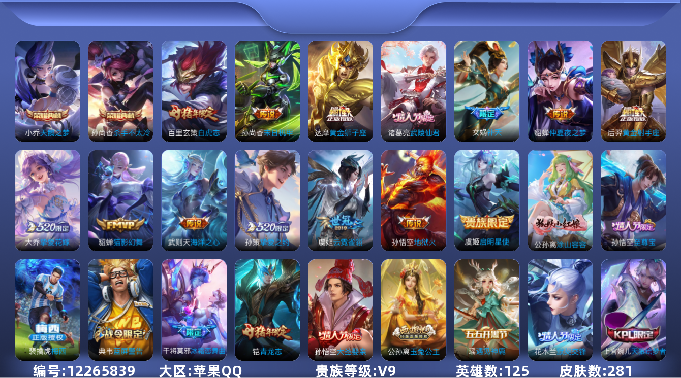 - [11519776]V9 2典藏 2无双 21传说 125英雄 260皮肤 可修改实名 女号 安全保护中 荣耀水晶:鸣剑·曳影,幻阙歌(貂蝉典藏) 无双皮:真我赫兹(瑶)(瑶无双),碎月剑心(李白无双) 传说皮:李逍遥,遇见胡旋,游龙清影(小青龙),山海·炽霜斩(李信年限),山海·琳琅生(小乔年限),仲夏夜之梦(大飞蛾),久胜战神,乞巧织情,挚爱花嫁,碎云,山海·苍雷引(电光曜子),鹤羽星尊,鹤归松栖(云缨),澜逐花归海 珍宝阁皮:蔷薇恋人,女武神 限定皮:愿照·众生和(妲己年限),逐霄战戟,鸣野蒿,凤凰于飞,傲雪梅枪,星穹之声,白鹤梁神女,山海·碧波行(瑶年限),至美·乘鲤谣,遇见飞天,高山流水,无限倾心-虞姬,五谷丰年,幽恒(沐浴露),梁祝,天狼狩猎者,天狼溯光者,逐梦之音,逐梦之影,辉光之辰,默契交锋-花木兰,乒乒小将,匿光追影者,女儿国国王,时之祈愿-瑶(瑶传限),玉兔公主,枫霜尽,神器·万象笔,山海·玄木吟(马可年限) 史诗皮:星界战将,器灵·浮梦炉,谪仙醉月,石田雨龙,炽弈燎原,化蝶舞,遇见神鹿,紫霞仙子,电玩小子(小书包),白龙吟,特工魅影,永昼,真我赫兹(百里守约),鹤归松栖(赵怀真),末日机甲-莱西奥,江河有灵,百解令(蒙犽),蒙恬荣光圣徽,冰冠公主,青蛇,晚萤,魅语,白蛇,猫狗日记-孙策,猫狗日记-大乔,乱世虎臣,节奏热浪,修罗,女仆咖啡,水果甜心,绅士熊喵,星夜王子,心灵骇客,德古拉伯爵,暗隐猎兽者,幽灵船长,鬼剑武藏,心灵战警,天秀·启明,舞动绿茵,地狱岩魂,诗语江南,拒霜思,缤纷独角兽,乘风破浪,逐浪之夏,月团寄思,金属风暴,圣诞狂欢,圣诞恋歌,鹰眼统帅,暗夜贵公子,魅力维加斯,赏金猎手,滕王阁序,无心,未来纪元-赵云,玫瑰异探