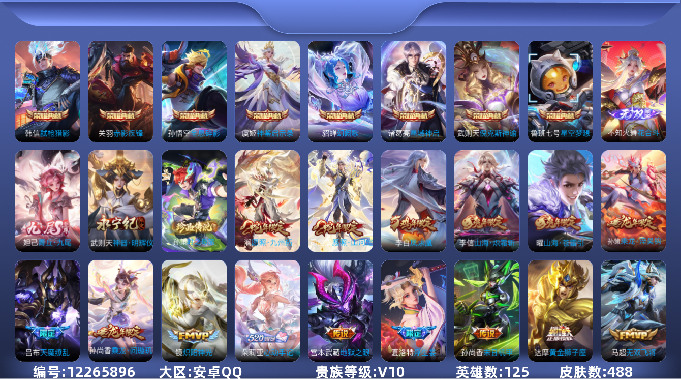 [12265896]V10 8典藏 3无双 1珍品传说 50传说 125英雄 488皮肤 典藏英雄武则天 可修改实名 优质装备:星空梦想(太空人),倪克斯神谕(宇宙婆娘),全息碎影(猴子典藏),星域神启(倪克斯贼亮),赤影疾锋,幻阙歌(貂蝉典藏),弑枪猎影(韩信典藏),神器·明辉仪,青丘·九尾(妲己无双),神鉴启示录,花合斗,黄金狮子座,黄金射手座,冠军飞将,云鹰飞将(小将军),绛天战甲(鸡嘴战神),黄金白羊座,猫影幻舞,久胜战神,炽阳神光,云霓雀翎,末日机甲-孙尚香(绿蚂蚱),地狱火,仲夏夜之梦(大飞蛾),音你心动-小乔,零号·赤焰,地狱之眼,音你心动-周瑜,胖达荣荣,乞巧织情,时之恋人-刘备(电焊工),淬星耀世,超时空战士-狄仁杰,末日机甲-孙策,无双飞将,音你闪耀(rap皮),碎云,天秀幻梦,神器·明辉仪,山海·炽霜斩(李信年限),山海·苍雷引(电光曜子),燃星之曲,画中仙,浮生妄,记忆之芯(机甲兔),青丘·九尾,百相守梦(张飞),鹤羽星尊,艾琳觅芳踪,金乌负日,朵莉亚心动手记,涂山容容 珍品传说:时之奇旅-孙策 传说皮:乘龙·问璇玑(孙尚香年限),乘龙·铭钟鼎(赵云年限),乘龙·淬吴钩(孙策年限),铠冥王哈迪斯,幻光神枪 珍宝阁皮:妄想食味,胡桃夹子,玩趣恶龙 限定皮:愿照·九州拓(澜年限),愿照·山河定(司空震年限),逐霄战戟,鸣野蒿,至尊宝,凤求凰(白切鸡),武陵仙君(小桃花),瑞麟志(木兰年限),遇见飞天,高山流水,怒海麟威,五谷丰年,冰锋战神,游园惊梦,梁祝,烈魂,李小龙,如梦令-后羿,孙行者,大圣娶亲,天魔缭乱,云端筑梦师,女儿国国王,神器·万象笔,山海·玄木吟(马可年限) 史诗皮:鸭鸭历险记-刘禅,化蝶舞,灵蛊蚀心,星界战将,龙之律动,石田雨龙,百相守梦-周瑜,茶境仙,怒海争锋,破空之剑,涂山红红,东方月初,蒙犽顽岩魄,芈月浮光幕影,海诺心动手记,蔬乡物语(鲁班七号),乘龙·聚宝船(安琪拉年限),乘龙·忆丹青(大乔年限),百相守梦-百里守约,百相守梦-黄忠,织梦人,遇见神鹿,紫霞仙子,苍穹之光,电玩小子(小书包),白龙吟,黄金分割率,特工魅影,千年之狐,永昼,江河有灵,魅语,百解令(蒙犽),高渐离燃音魔法,蒙恬荣光圣徽,无限星赏官,冰冠公主,青蛇,偶像歌手,白蛇,晚萤,电玩·爆裂旋风,百相守梦(刘备),暗夜猫娘,百相守梦(关羽),银翎春语,龙骑士(小龙虾),末日