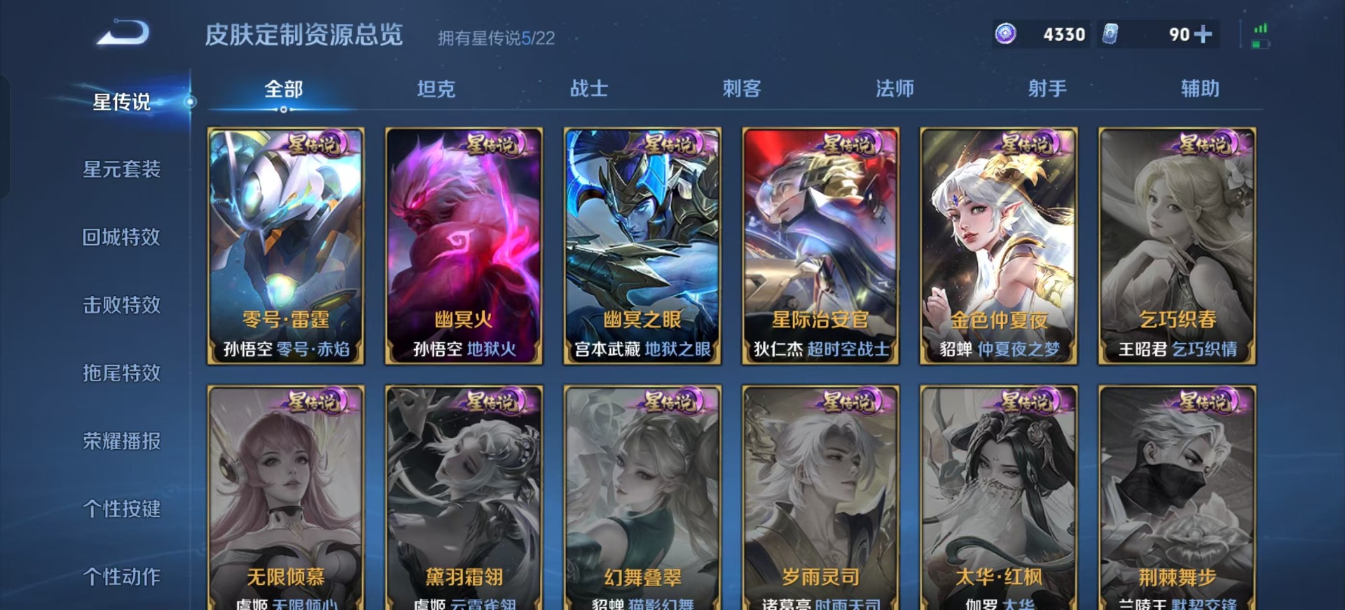 黄忠烈魂,甄姬女儿国国王,后羿如梦令,庄周云端筑梦师,司空震愿照·山河定,裴擒虎李小龙,上官婉儿梁祝,上官婉儿神器·万象笔,花木兰瑞麟志,马可波罗山海·玄木吟,桑启鸣野蒿,孙悟空孙行者,孙悟空大圣娶亲,孙悟空至尊宝,澜愿照·九州拓,关羽冰锋战神