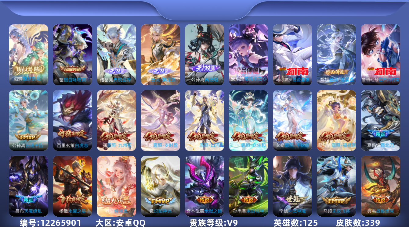 [12265901]V9 1典藏 1珍品无双 3无双 4珍品传说 42传说 125英雄 339皮肤 可修改实名 优质装备:馥梦繁花,银白咏叹调(倪克斯侍卫),离恨烟(公孙离无双),器灵·螭龙剑,天机白泽,江户川柯南,怪盗基德,器灵·落星盏,酷洛米之心,黄金射手座,绛天战甲(鸡嘴战神),黄金白羊座,久胜战神,炽阳神光,一念神魔,末日机甲-孙尚香(绿蚂蚱),地狱之眼,乞巧织情,游龙清影(小青龙),淬星耀世,花朝如约(花篮子),无双飞将,音你闪耀(rap皮),鹤羽星尊,鹤归松栖(云缨),遇见神鼓,琥珀纪元铠,玄雷天君,涂山容容 传说皮:貂蝉曦玄引,典韦战鼓燎原,云诺千山,续相思,星之鸣奏,幻光神枪 珍宝阁皮:优雅恋人,蔷薇恋人 限定皮:愿照·九州拓(澜年限),愿照·福禄聚(蔡文姬年限),愿照·岁时盈(虞姬年限),愿照·山河定(司空震年限),愿照·众生和(妲己年限),愿照·千秋盛(女娲年限),逐霄战戟,映山客,陌上桑,鸣野蒿,夏侯惇霜北刀,至尊宝,白虎志(电光耗子),傲雪梅枪,星穹之声,至美·乘鲤谣,遇见飞天,无限倾心-虞姬,怒海麟威,五谷丰年,青龙志(铠年限),冰锋战神,御风骁将(吕布年限),龙胆,逐梦之翼,逐梦之星,永曜之星,孙行者,大圣娶亲,引擎之心,天魔缭乱,启示之音,冰霜神祇 史诗皮:苍鳞隐世,糖绘人间,狼魂孤将,绮世丹青,瑰影绮梦,化蝶舞,星界战将,龙之律动,雪豹·霜爪,藏狐·褐绒,石田雨龙,戍鼓铭心,茶境仙,怒海争锋,破空之剑,蒙犽顽岩魄,芈月浮光幕影,琥珀纪元伽罗,上官婉儿群星魔术团,蔬乡物语(鲁班七号),百相守梦-百里守约,守夜人,紫霞仙子,电玩小子(小书包),特工魅影,千年之狐,匿光侦查者,浮梦罗烟,魅语,百解令(蒙犽),高渐离燃音魔法,蒙恬荣光圣徽,冰冠公主,白蛇,晚萤,暗夜猫娘,末日机甲-吕布,猫狗日记-孙策,猫狗日记-大乔,时之恋人-孙尚香,乱世虎臣,节奏热浪,女仆咖啡,摇滚巨星,水果甜心,绅士熊喵,天才门将,星夜王子,心灵骇客,功夫厨神,德古拉伯爵,暗隐猎兽者,鬼剑武藏,心灵战警,舞动绿茵,地狱岩魂,纤云弄巧,缤纷独角兽,乘风破浪,逐浪之夏,月团寄思,水晶猎龙者,曙光守护者,箭羽风息,金属风暴,圣诞狂欢,圣诞恋歌,鹰眼统帅,魅力维加斯,无心,未来纪元-赵云