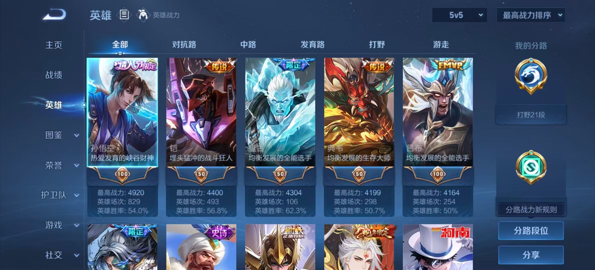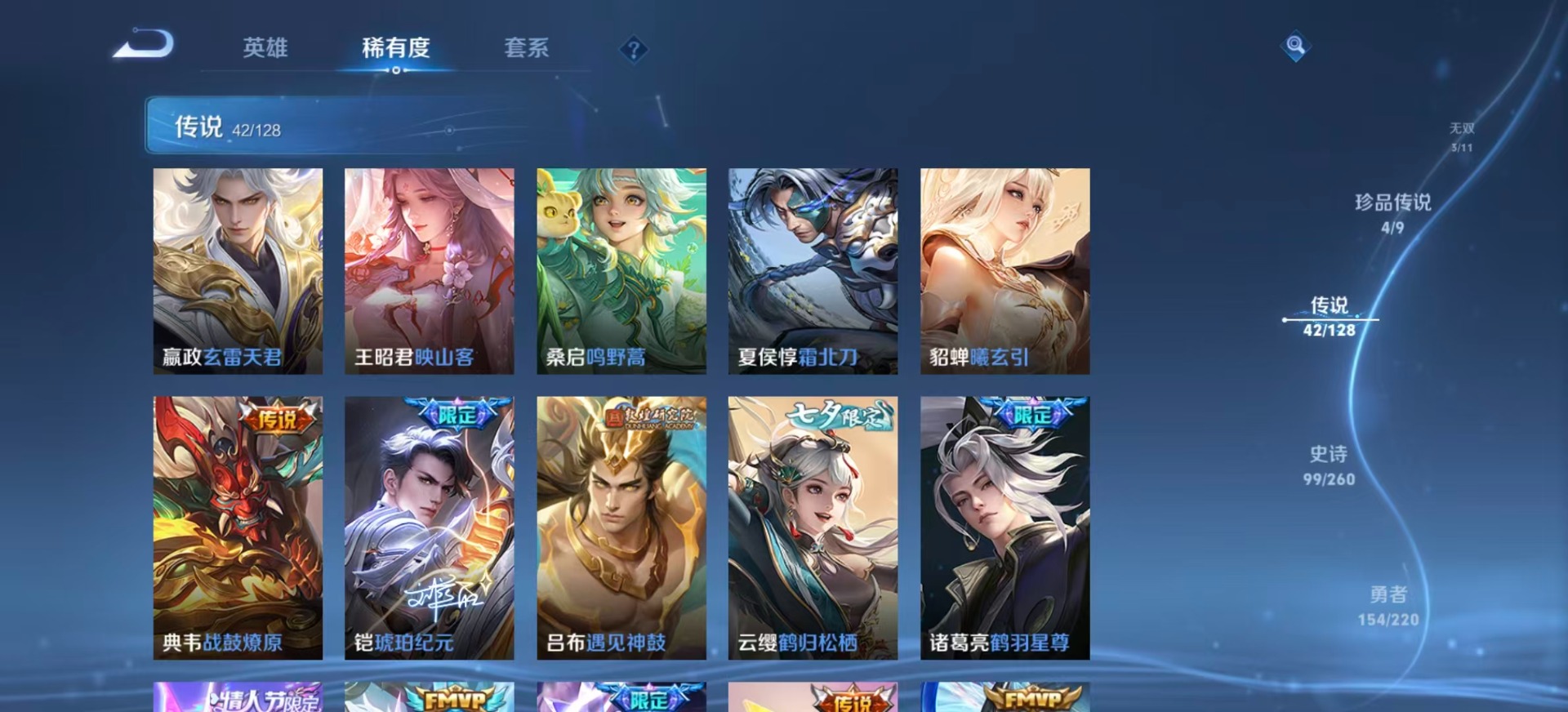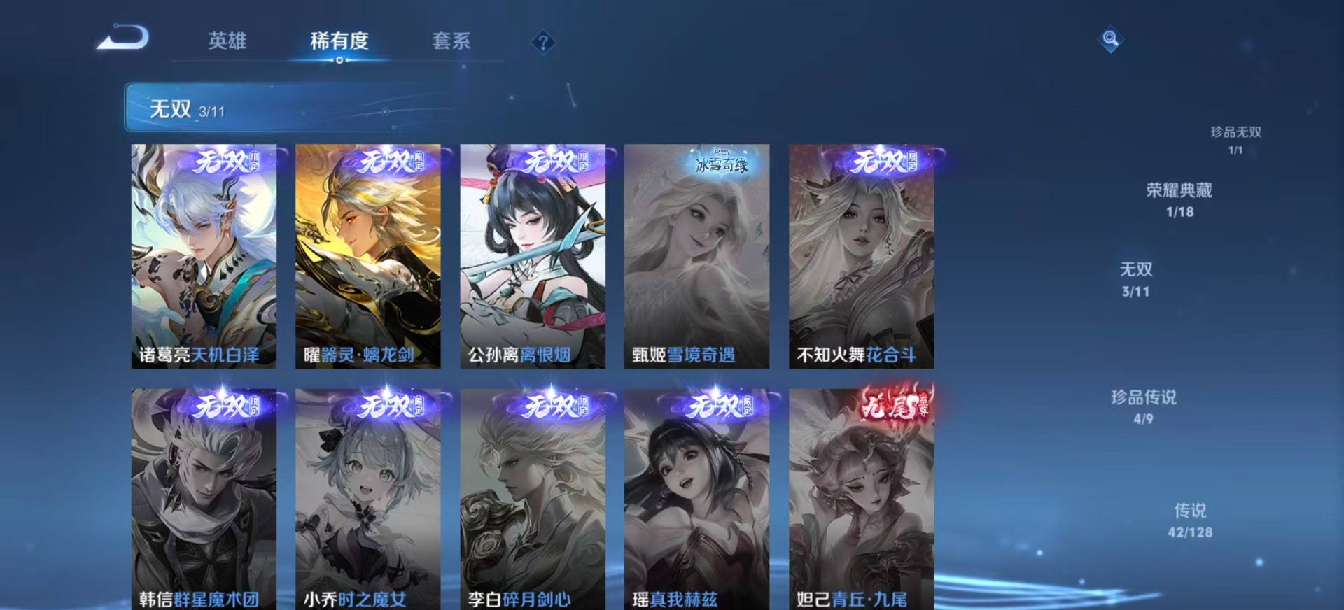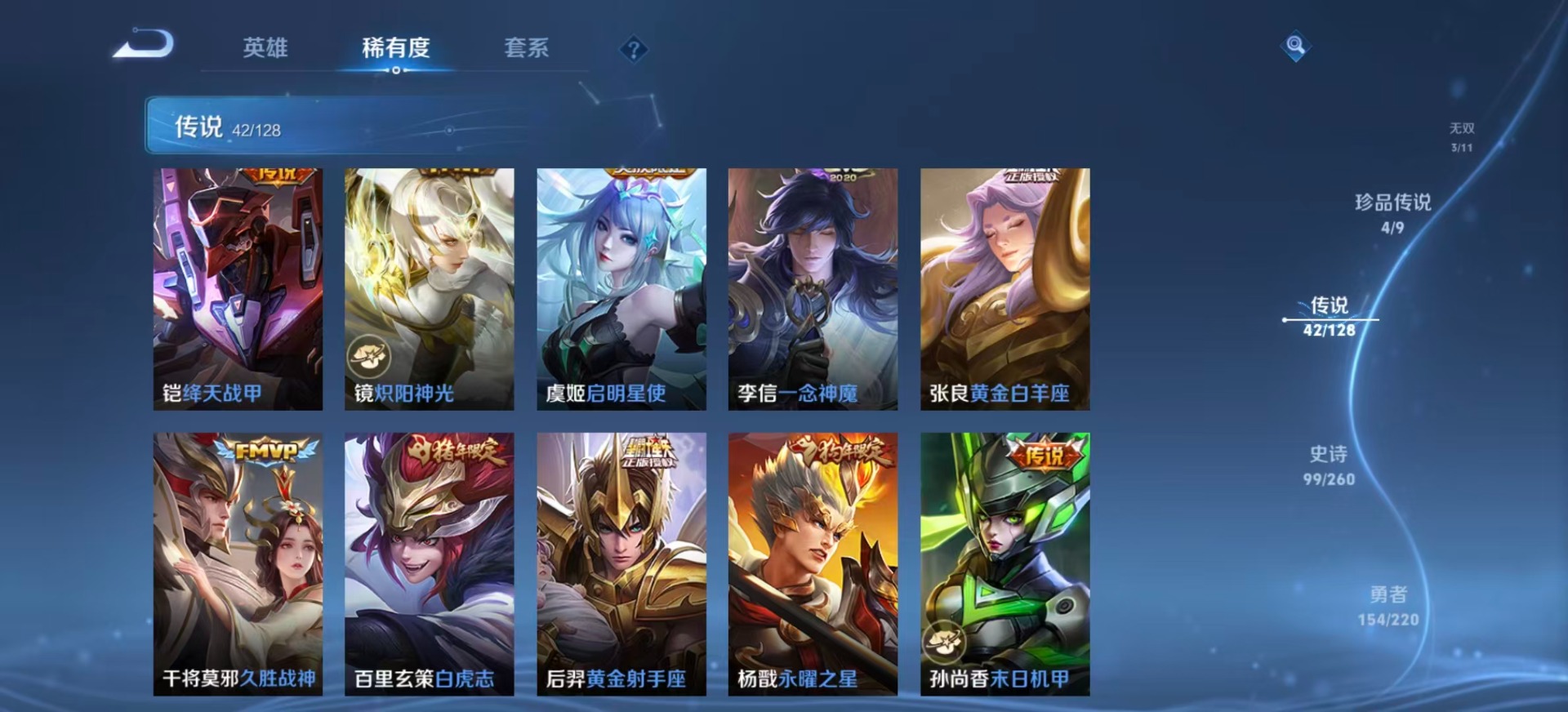 - [11658046]V9 1典藏 1珍品传说 21传说 126英雄 284皮肤 典藏英雄武则天 可修改实名 优质装备:鸣剑·曳影,江户川柯南,黄金狮子座,冠军飞将,云鹰飞将(小将军),黄金白羊座,久胜战神,炽阳神光,一念神魔,仲夏夜之梦(大飞蛾),地狱之眼,乞巧织情,时之恋人-刘备(电焊工),淬星耀世,挚爱之约,无双飞将,涂山容容 传说皮:乘龙·问璇玑(孙尚香年限) 珍宝阁皮:妄想食味,蔷薇恋人 限定皮:逐霄战戟,映山客,鸣野蒿,至尊宝,高山流水,五谷丰年,武圣,游园惊梦,天狼狩猎者,龙胆,如梦令-后羿,孙行者,猪悟能,匿光追影者,寅虎·瑞焰(虎皮蛋子),寅虎·赤拳(老虎年限),玉兔公主,山海·玄木吟(马可年限) 史诗皮:化蝶舞,龙之律动,石田雨龙,茶境仙,破空之剑,琥珀纪元伽罗,百相守梦-百里守约,百相守梦-黄忠,紫霞仙子,电玩小子(小书包),特工魅影,千年之狐,江河有灵,魅语,高渐离燃音魔法,蒙恬荣光圣徽,无限星赏官,冰冠公主,偶像歌手,电玩·爆裂旋风,百相守梦(刘备),暗夜猫娘,末日机甲-吕布,猫狗日记-孙策,乱世虎臣,节奏热浪,修罗,女仆咖啡,摇滚巨星,水果甜心,绅士熊喵,天才门将,星夜王子,功夫厨神,德古拉伯爵,暗隐猎兽者,幽灵船长,鬼剑武藏,暗渊魔法,心灵战警,乐园奇幻夜,舞动绿茵,纤云弄巧,拒霜思,缤纷独角兽,乘风破浪,逐浪之夏,水晶猎龙者,曙光守护者,热力回旋,金属风暴,原初追逐者,圣诞狂欢,圣诞恋歌,鹰眼统帅,赏金猎手,无心,未来纪元-赵云