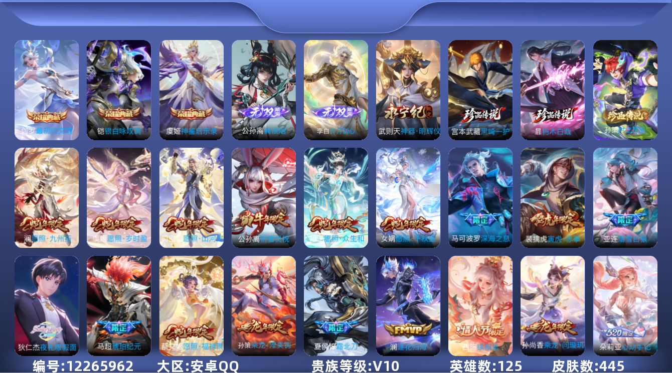 [12265962]V10 3典藏 3无双 3珍品传说 65传说 125英雄 445皮肤 可修改实名 优质装备:银白咏叹调(倪克斯侍卫),神器·明辉仪,碎月剑心(李白无双),神鉴启示录,离恨烟(公孙离无双),最初的交响(伽罗典藏),朽木白哉,黑崎一护,黄金狮子座,黄金射手座,云鹰飞将(小将军),绛天战甲(鸡嘴战神),黄金白羊座,猫影幻舞,末日机甲-孙尚香(绿蚂蚱),地狱之眼,胖达荣荣,乞巧织情,时之恋人-刘备(电焊工),游龙清影(小青龙),淬星耀世,碎云,天秀幻梦,神器·明辉仪,炽翼辉光(娃娃菜牛角包),画中仙,浮生妄,记忆之芯(机甲兔),百相守梦(张飞),灼幽烈阳,鹤归松栖(云缨),遇见神鼓,鲁班七号-时之奇旅,大乔-时之奇旅,永恒水手月亮,夜礼服假面,霜月吟,澜逐花归海,艾琳觅芳踪,琥珀纪元铠,琥珀纪元马超,黄金天蝎座,朵莉亚心动手记,牧神诗旅,玄雷天君,涂山容容 珍品传说:时之奇旅-孙策 传说皮:乘龙·问璇玑(孙尚香年限),乘龙·铭钟鼎(赵云年限),乘龙·淬吴钩(孙策年限),貂蝉曦玄引,吕布曦玄引,典韦战鼓燎原,落雪白狼,铠冥王哈迪斯,续相思,星之鸣奏,祥瑞亨通,幻光神枪 珍宝阁皮:万物之道,蔷薇恋人 限定皮:愿照·九州拓(澜年限),愿照·福禄聚(蔡文姬年限),愿照·岁时盈(虞姬年限),愿照·山河定(司空震年限),愿照·众生和(妲己年限),愿照·千秋盛(女娲年限),陌上桑,鸣野蒿,夏侯惇霜北刀,至尊宝,傲雪梅枪,寅虎·展翼(孙膑年限),绯月行,白鹤梁神女,魔法小厨娘,白晶晶,时雨天司(水龙头),飞衡(韩信年限),瑞麟志(木兰年限),至美·乘鲤谣,至美·化雀舞,影龙天霄,怒海麟威,五谷丰年,冰锋战神,游园惊梦,御风骁将(吕布年限),龙胆,烈魂,岱宗(典韦年限),虎魄,天狼征服者,奔雷神使(牛魔年限),祈雪灵祝(雪兔子),玄武志(苏烈年限),奇迹圣诞,默契交锋-花木兰,孙行者,猪悟能,冰霜恋舞曲,乒乒小将,女儿国国王,寅虎·御盾(廉颇年限),寅虎·瑞焰(虎皮蛋子),寅虎·心曲(虎婆),寅虎·赤拳(老虎年限),玉兔公主,深海之息(深海大菠萝),唐三藏,匿光启智者,时之奇旅-妲己,神器·万象笔,梦圆繁星 史诗皮:赞萌露比,鸭鸭历险记-刘禅,飞车小橘子,苍鳞隐世,器灵·浮梦炉,糖绘人间,狼魂孤将,化蝶舞,星界战将,谪仙醉月,龙之律动,石田雨龙,百相守梦-周瑜,茶境仙,怒海争锋,炽弈燎原