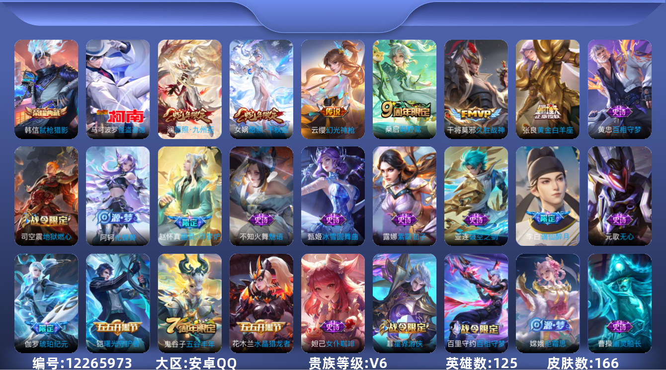 [12265973]V6 1典藏 1珍品传说 6传说 125英雄 166皮肤 可修改实名 优质装备:弑枪猎影(韩信典藏),怪盗基德,黄金白羊座,久胜战神 传说皮:幻光神枪 珍宝阁皮:优雅恋人,蔷薇恋人 限定皮:愿照·九州拓(澜年限),愿照·千秋盛(女娲年限),逐霄战戟,鸣野蒿,遇见飞天,高山流水,五谷丰年 史诗皮:器灵·浮梦炉,化蝶舞,星界战将,谪仙醉月,茶境仙,破空之剑,琥珀纪元伽罗,蔬乡物语(鲁班七号),百相守梦-百里守约,百相守梦-黄忠,紫霞仙子,苍穹之光,黄金分割率,特工魅影,千年之狐,江河有灵,魅语,蒙恬荣光圣徽,冰冠公主,偶像歌手,龙骑士(小龙虾),末日机甲-吕布,猫狗日记-孙策,节奏热浪,女仆咖啡,水果甜心,心灵骇客,功夫厨神,德古拉伯爵,暗隐猎兽者,幽灵船长,鬼剑武藏,心灵战警,乐园奇幻夜,天秀·启明,拒霜思,缤纷独角兽,乘风破浪,逐浪之夏,月团寄思,水晶猎龙者,曙光守护者,箭羽风息,唤灵魅影,金属风暴,原初追逐者,鹰眼统帅,暗夜贵公子,无心,未来纪元-赵云