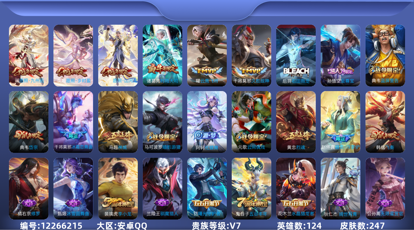 [12266215]V7 6传说 124英雄 247皮肤 可修改实名 优质装备:云鹰飞将(小将军),久胜战神 珍宝阁皮:蔷薇恋人,玩趣恶龙 限定皮:愿照·九州拓(澜年限),愿照·岁时盈(虞姬年限),愿照·山河定(司空震年限),至尊宝,时雨天司(水龙头),神威(电光马子),飞衡(韩信年限),五谷丰年,梁祝,烈魂,岱宗(典韦年限),李小龙,冰霜恋舞曲 史诗皮:器灵·浮梦炉,糖绘人间,绮世丹青,化蝶舞,石田雨龙,茶境仙,黄金分割率,特工魅影,千年之狐,无限星赏官,龙骑士(小龙虾),末日机甲-吕布,乱世虎臣,修罗,女仆咖啡,摇滚巨星,水果甜心,功夫厨神,暗隐猎兽者,幽灵船长,鬼剑武藏,心灵战警,舞动绿茵,地狱岩魂,纤云弄巧,繁星吟游(呼啦呼啦),缤纷独角兽,乘风破浪,逐浪之夏,水晶猎龙者,曙光守护者,箭羽风息,原初追逐者,圣诞狂欢,圣诞恋歌,鹰眼统帅,魅力维加斯,黎明之约,未来纪元-赵云