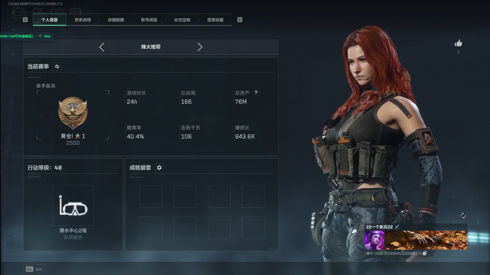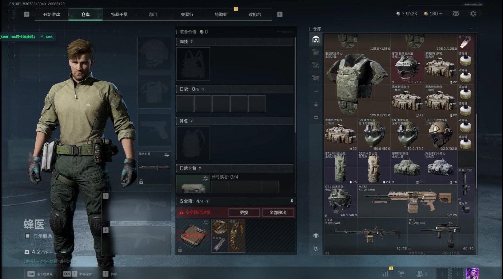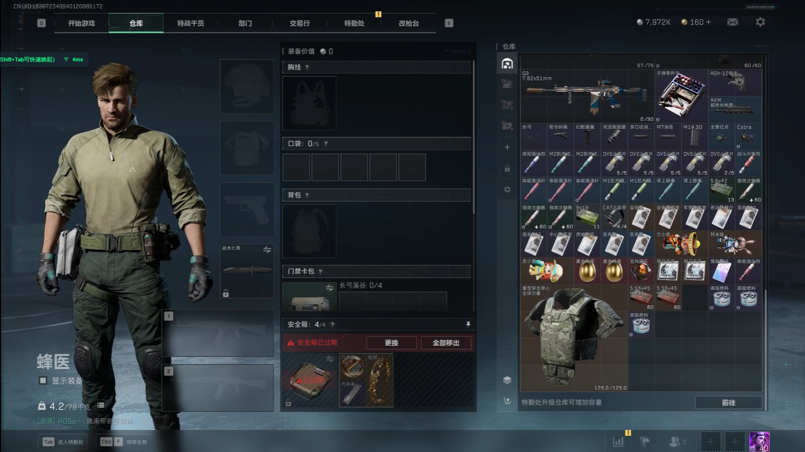 - [11439205]总资产:97.9M 1干员外观 2近战传说 19传说枪械 哈夫币:2.962K 高级安全箱(9.17到期) 可二次 可修改实名 优质装备:近战-黑海,近战-北极星 烽火地带段位:黑鹰 全面战场段位:上等兵 传说武器皮肤:UZI冲锋枪-特斯拉线圈,M16A4突击步枪-狩猎时刻,AK-12突击步枪-特斯拉线圈,SR-3M紧凑突击步枪-特斯拉线圈,勇士冲锋枪-能天使-午夜邮差,Vector冲锋枪-狩猎时刻,G3战斗步枪-狩猎时刻,M250通用机枪-游乐场,M14射手步枪-工业审判,复合弓-黑-天际线,K437突击步枪-北极星,QCQ171冲锋枪-北极星,725双管霰弹枪-送葬人-无题密令,M4A1突击步枪-阿米娅,M4A1突击步枪-蚀金玫瑰,MP5冲锋枪-黑海,QJB201轻机枪-黑海 史诗武器皮肤:Ash-12战斗步枪-守夜人,M16A4突击步枪-竞赛选手,PKM通用机枪-守夜人,AS Val突击步枪-尖端治疗,M700狙击步枪-守夜人,SG552突击步枪-尖端治疗,SR-25射手步枪-尖端治疗,M1014霰弹枪-林中猎手,AKM突击步枪-林中猎手,SV-98狙击步枪-林中猎手,PTR-32突击步枪-英雄,PKM通用机枪-荒野求生,腾龙突击步枪-无垢,MP7冲锋枪-无垢,PSG-1射手步枪-无垢,SVD狙击步枪-荒野求生,SR-3M紧凑突击步枪-荒野求生,SVD狙击步枪-阿萨拉工艺 干员外观:红狼-蚀金玫瑰