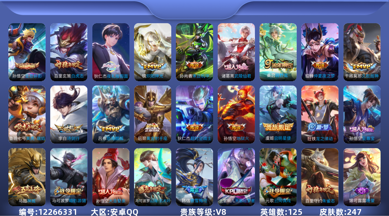 [12266331]V8 1典藏 15传说 125英雄 247皮肤 可修改实名 优质装备:全息碎影(猴子典藏),黄金射手座,久胜战神,炽阳神光,末日机甲-孙尚香(绿蚂蚱),地狱火,仲夏夜之梦(大飞蛾),超时空战士-狄仁杰,夜礼服假面 珍宝阁皮:优雅恋人,女武神 限定皮:逐霄战戟,鸣野蒿,至尊宝,白虎志(电光耗子),武陵仙君(小桃花),傲雪梅枪,神威(电光马子),诗剑行,怒海麟威,五谷丰年,天狼绘梦者,李小龙,朱雀志(守约年限),一生所爱,大圣娶亲,匿光追影者,寅虎·瑞焰(虎皮蛋子),百木心枪,山海·玄木吟(马可年限) 史诗皮:星界战将,龙之律动,紫霞仙子,黄金分割率,千年之狐,永昼,江河有灵,雪夜绮愿(周瑜),百解令(蒙犽),蒙恬荣光圣徽,无限星赏官,冰冠公主,偶像歌手,晚萤,末日机甲-吕布,猫狗日记-孙策,猫狗日记-大乔,乱世虎臣,节奏热浪,修罗,女仆咖啡,摇滚巨星,水果甜心,天才门将,星夜王子,功夫厨神,德古拉伯爵,暗隐猎兽者,幽灵船长,鬼剑武藏,暗渊魔法,心灵战警,地狱岩魂,繁星吟游(呼啦呼啦),拒霜思,缤纷独角兽,乘风破浪,逐浪之夏,水晶猎龙者,曙光守护者,箭羽风息,金属风暴,原初追逐者,圣诞狂欢,鹰眼统帅,魅力维加斯,黎明之约,赏金猎手,无心,未来纪元-赵云