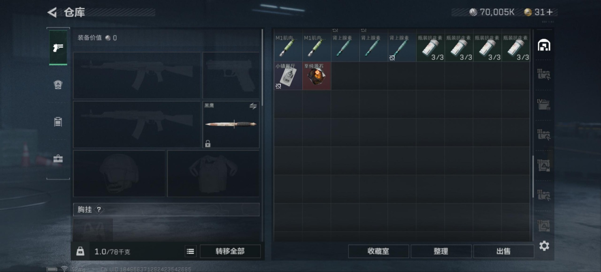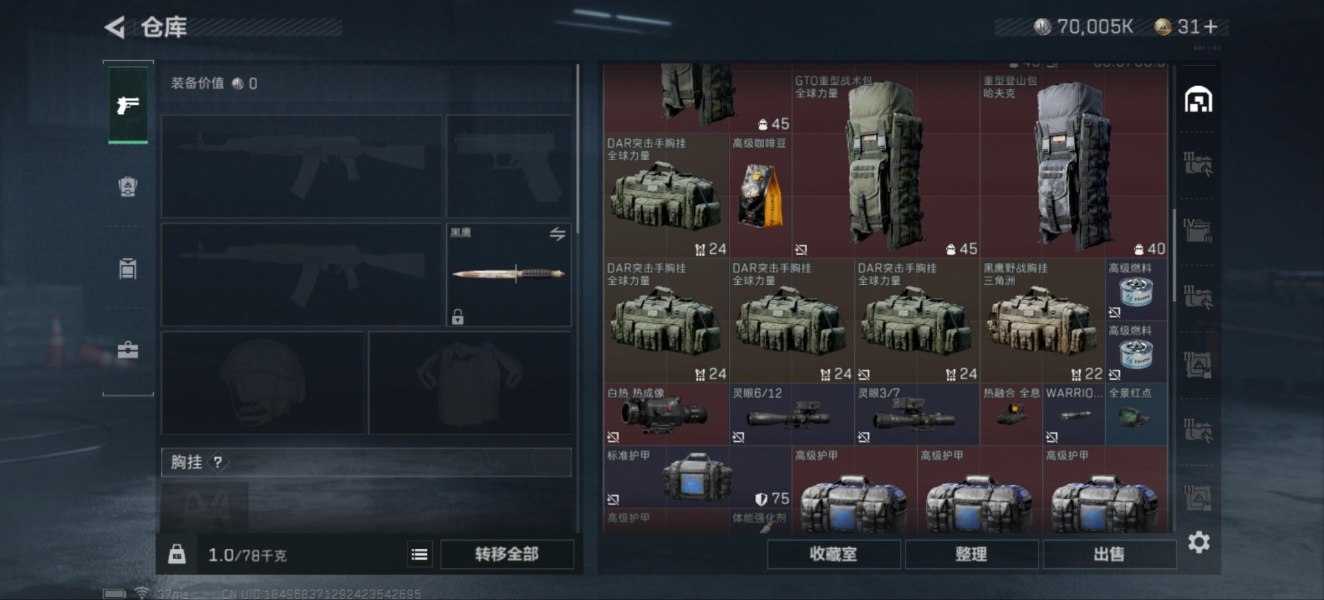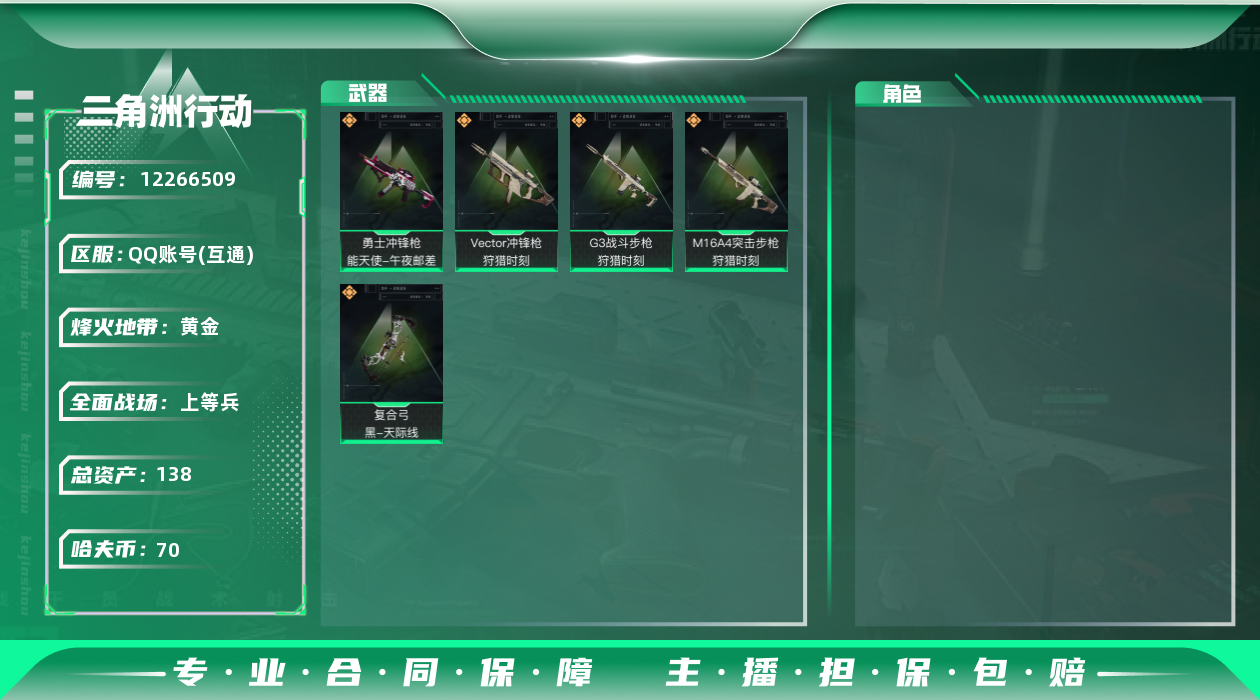 [12266509]总资产:138.5M 5传说枪械 哈夫币:70.005K 可二次 可修改实名 烽火地带段位:黄金 全面战场段位:上等兵 传说武器皮肤:M16A4突击步枪-狩猎时刻,勇士冲锋枪-能天使-午夜邮差,Vector冲锋枪-狩猎时刻,G3战斗步枪-狩猎时刻,复合弓-黑-天际线