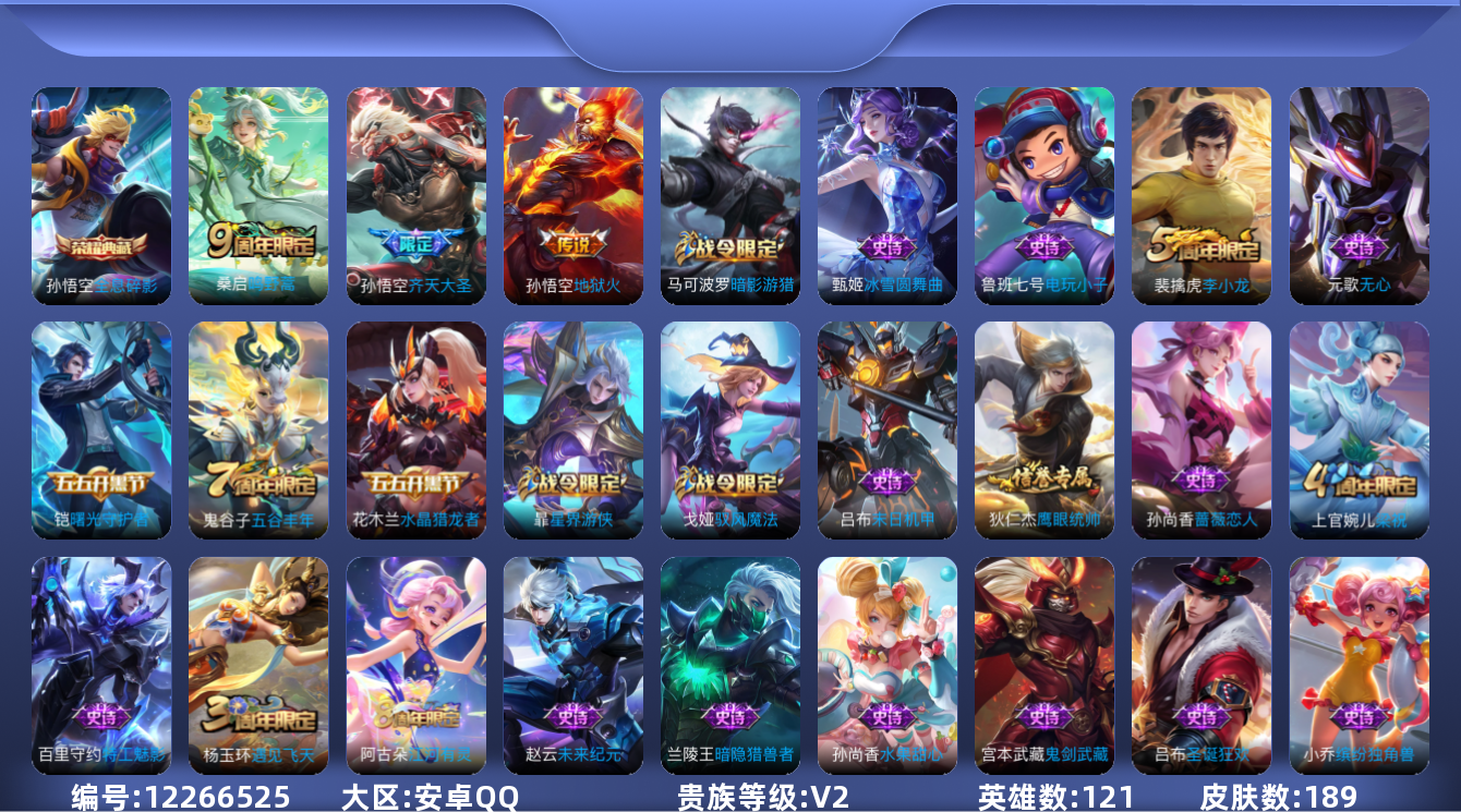 [12266525]【商品标题】:安卓Q-V2-永恒钻石IV段位-121英雄-189皮肤-1典藏-0珍品无双-0无双-0珍品传说-3传说-34史诗
