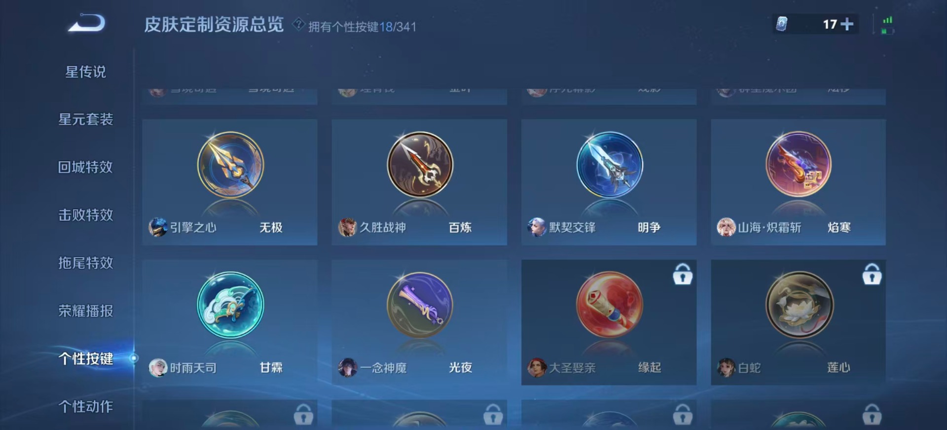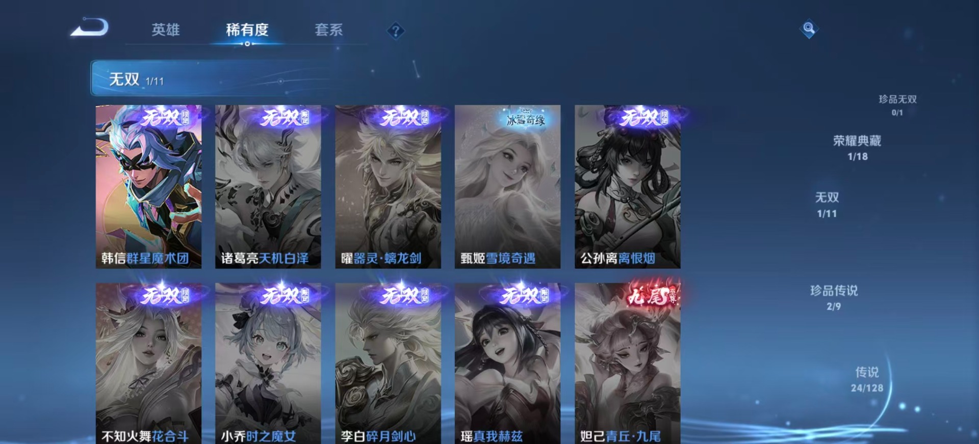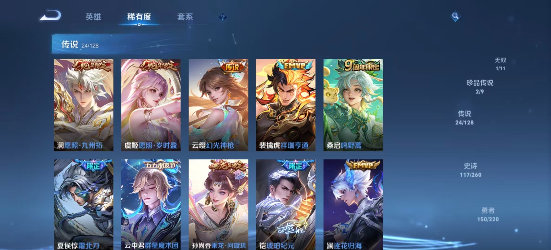 铠琥珀纪元,干将莫邪久胜战神,李信一念神魔,孙策挚爱之约,孙尚香乘龙·问璇玑,王昭君乞巧织情,镜炽阳神光,裴擒虎祥瑞亨通,张良黄金白羊座,云中君群星魔术团,澜逐花归海,云缨幻光神枪
