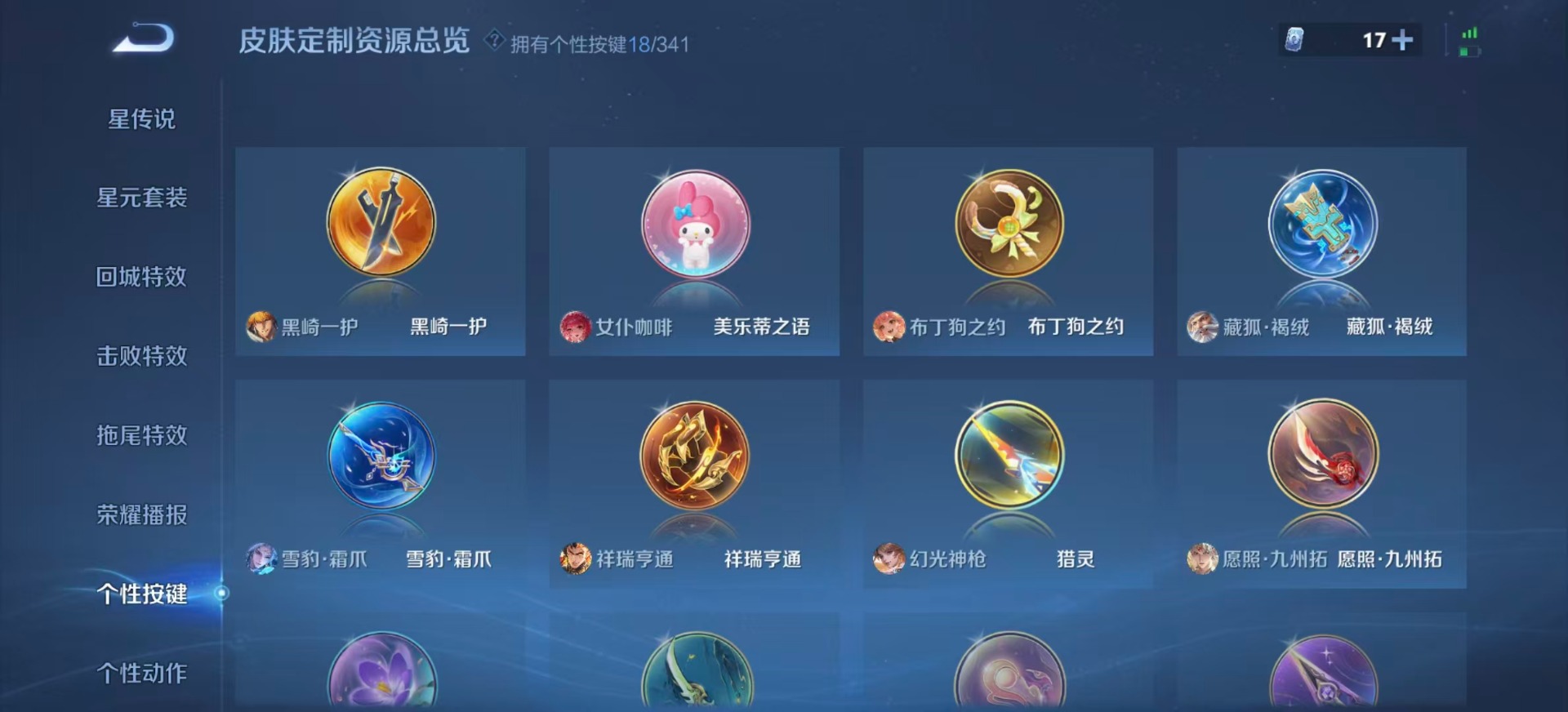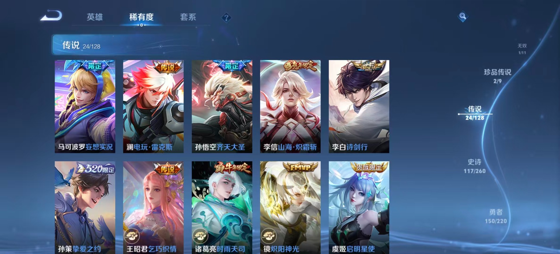 夏侯惇霜北刀,黄忠烈魂,鲁班七号乒乒小将,吕布御风骁将,后羿如梦令,诸葛亮时雨天司,公孙离玉兔公主,上官婉儿梁祝,李白诗剑行,花木兰默契交锋,安琪拉魔法小厨娘,马可波罗山海·玄木吟,桑启鸣野蒿,孙悟空孙行者,孙悟空大圣娶亲,芈月白晶晶,孙悟空至尊宝,孙悟空美猴王,赵云引擎之心,澜愿照·九州拓,虞姬愿照·岁时盈