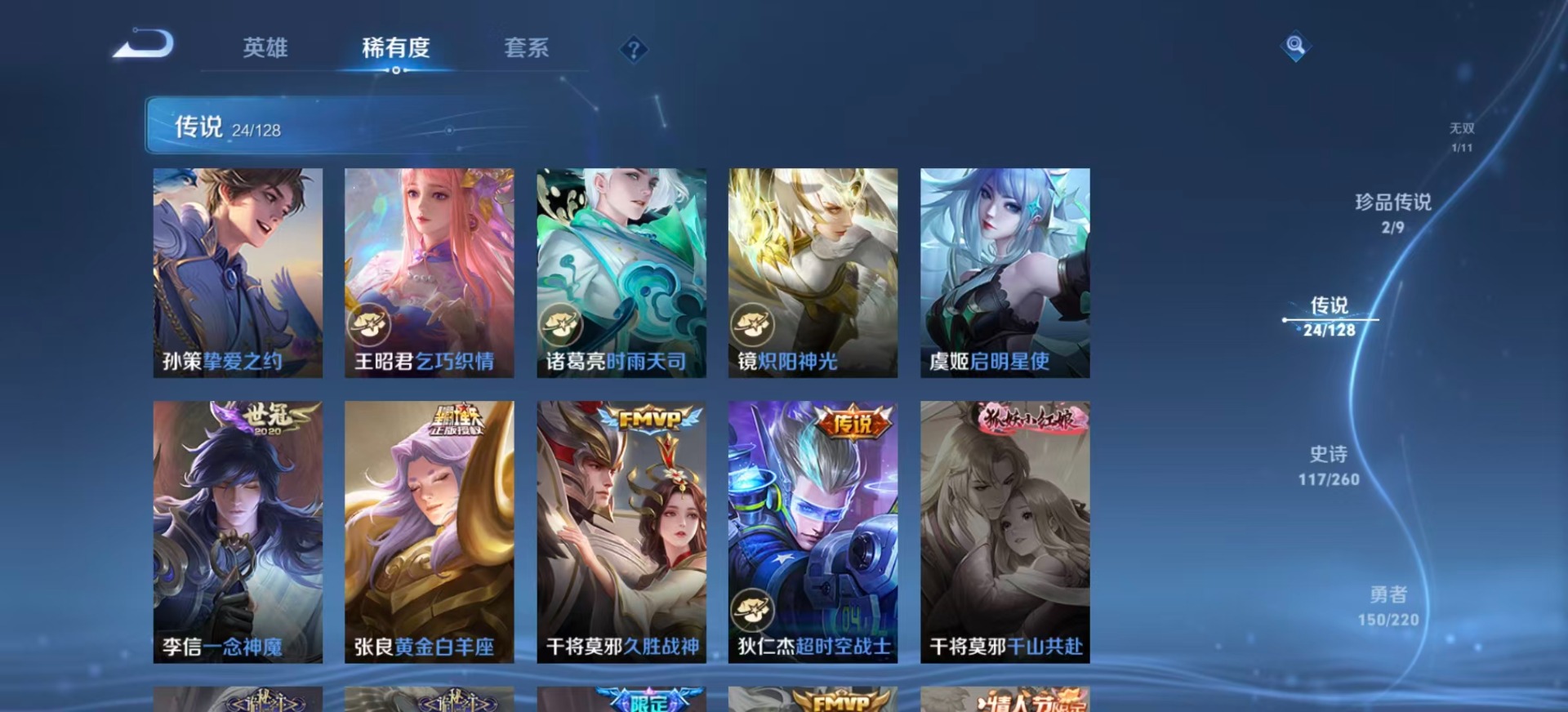大乔猫狗日记,高渐离燃音魔法,海诺心动手记,夏侯惇乘风破浪,阿轲暗夜猫娘,阿轲节奏热浪,铠曙光守护者,刘备百相守梦,曹操幽灵船长,伽罗箭羽风息,廉颇地狱岩魂,伽罗琥珀纪元,小乔缤纷独角兽,小乔青蛇,孙策猫狗日记,项羽苍穹之光,吕布圣诞狂欢,吕布末日机甲,露娜紫霞仙子,周瑜雪夜绮愿,诸葛亮黄金分割率,刘禅电玩·爆裂旋风,司马懿暗渊魔法,刘禅天才门将,刘禅绅士熊喵,宫本武藏鬼剑武藏,公孙离无限星赏官,兰陵王暗隐猎兽者,貂蝉圣诞恋歌,貂蝉唤灵魅影,花木兰水晶猎龙者,李白千年之狐,夏洛特永昼,上官婉儿群星魔术团,安琪拉心灵骇客,蒙犽百解令,杨戬天秀·启明,白起星夜王子,亚瑟心灵战警,嬴政暗夜贵公子,程咬金功夫厨神,百里玄策原初追逐者,雅典娜冰冠公主,百里守约真我赫兹,百里守约特工魅影,李元芳逐浪之夏,墨子金属风暴,蔡文姬舞动绿茵,澜赏金猎手,娜可露露晚萤,王昭君偶像歌手,嫦娥拒霜思,钟馗乐园奇幻夜,橘右京修罗,关羽决胜骁骑