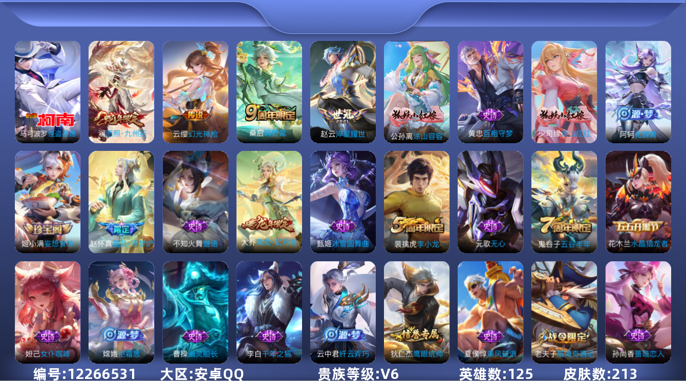 [12266531]V6 1珍品传说 4传说 125英雄 213皮肤 可修改实名 社交场景限制 优质装备:怪盗基德,淬星耀世,涂山容容 传说皮:幻光神枪 珍宝阁皮:妄想食味,蔷薇恋人,女武神 限定皮:愿照·九州拓(澜年限),逐霄战戟,鸣野蒿,寅虎·展翼(孙膑年限),遇见飞天,高山流水,五谷丰年,梁祝,李小龙,匿光启智者,梦圆繁星 史诗皮:器灵·浮梦炉,化蝶舞,星界战将,涂山红红,蒙犽顽岩魄,乘龙·忆丹青(大乔年限),百相守梦-黄忠,千年之狐,江河有灵,魅语,蒙恬荣光圣徽,冰冠公主,猫狗日记-孙策,猫狗日记-大乔,乱世虎臣,节奏热浪,女仆咖啡,摇滚巨星,水果甜心,天才门将,星夜王子,德古拉伯爵,暗隐猎兽者,幽灵船长,鬼剑武藏,舞动绿茵,地狱岩魂,纤云弄巧,拒霜思,缤纷独角兽,乘风破浪,逐浪之夏,水晶猎龙者,金属风暴,原初追逐者,圣诞狂欢,鹰眼统帅,魅力维加斯,黎明之约,无心,未来纪元-赵云